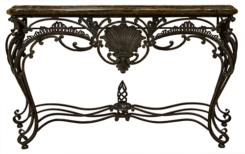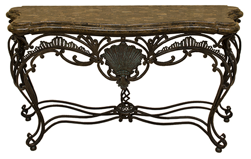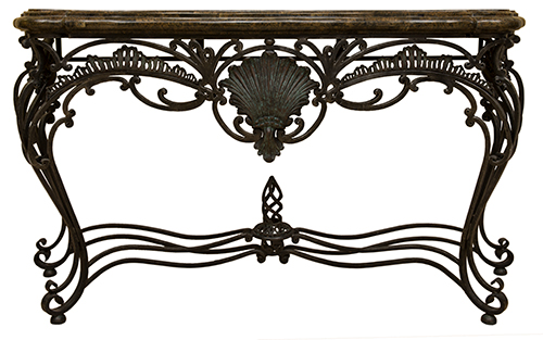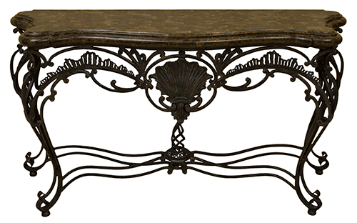 Manifattura siciliana (?), XX secolo Coppia di consolle Ferro battuto, piano impiallacciato in marmo composito 91x164x51 cm Il bene è libero da vincoli Condizione supporto: 90% Condizione superficie: 80% (ossidazioni) 2 oggetti Periodo: 1900 - 1960 Categoria: Mobili