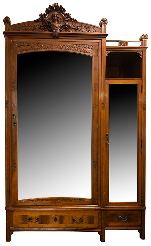 Manifattura siciliana (?), I metà del XX secolo (?) Armadio Legno intagliato,specchio 262x161x54 cm Il bene è libero da vincoli Condizione supporto: 80% Condizione superficie: 80% Armadio con anta a specchio, decorato con ghirlande e testa di donna in cammeo nella cimasa Periodo: 1900 - 1960 Categoria: Mobili