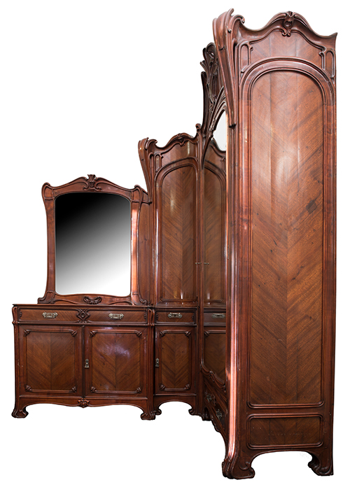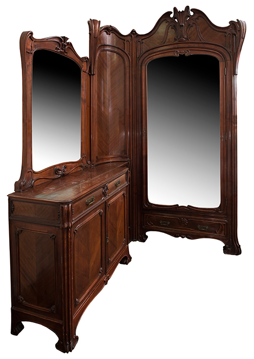 Manifattura siciliana (?), I metà del XX secolo Mobile ad angolo Legno lastronato in essenze varie e decorato con intagli floreali 261x260x45 cm Il bene è libero da vincoli Condizione supporto: 90% Condizione superficie: 80% Mobile costituito da un armadio con anta a specchio, un corpo centrale con tre ante, tre cassetti ed una specchiera da parete Periodo: 1900 - 1960 Categoria: Mobili