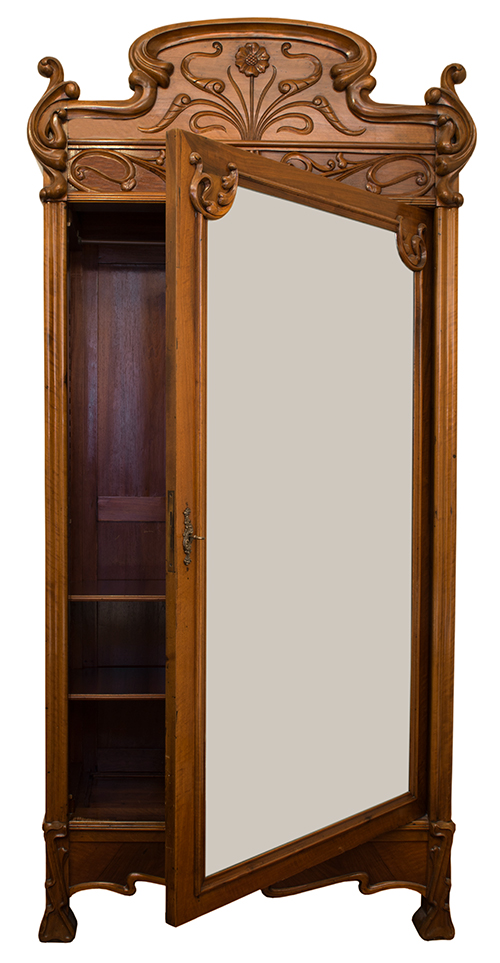Manifattura siciliana (?), I quarto del XX secolo (?) Armadio Legno intagliato 272x121x51 cm Il bene è libero da vincoli Condizione supporto: 90% Condizione superficie: 90% Armadio con singola anta a specchio e cimasa intagliata a motivi vegetali Liberty Periodo: 1900 - 1960 Categoria: Mobili