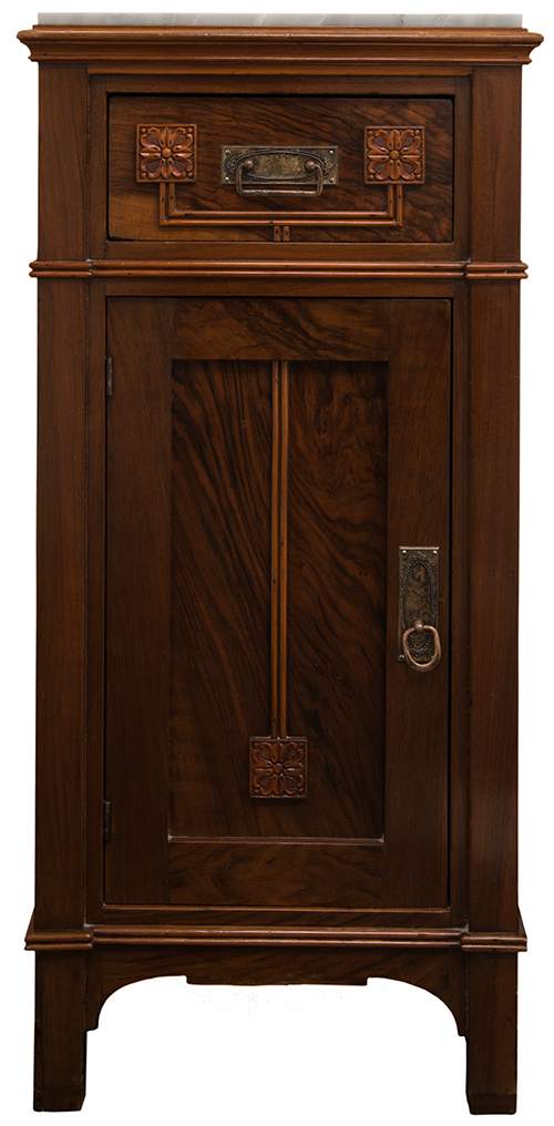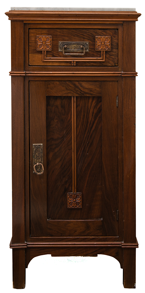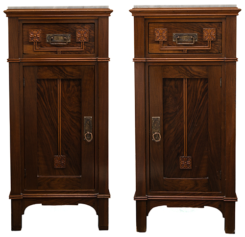 Manifattura siciliana (?), I quarto del XX secolo (?) Coppia di comodini Liberty Legno, bronzo e marmo bianco 90,5x39,5x35 cm Il bene è libero da vincoli Condizione supporto: 90% Condizione superficie: 80% 2 oggetti Comodini Liberty con cassetto sottopiano ed anta sottostante. Maniglie metalliche e piano marmoreo Periodo: 1900 - 1960 Categoria: Mobili