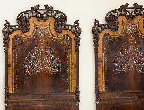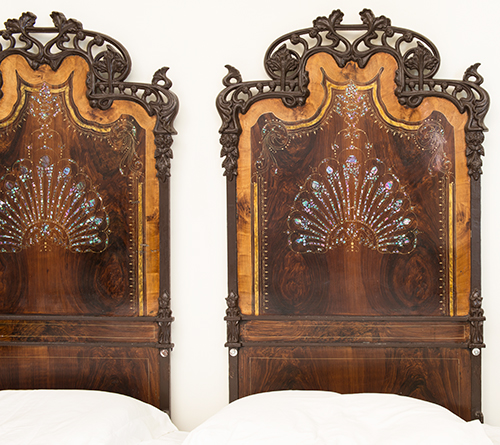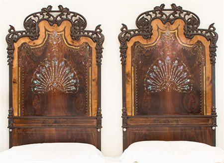 Manifattura siciliana (?), I quarto del XX secolo (?) Coppia di capoletti Metallo e ferro battuto e dipinto 178x81x4 cm Il bene è libero da vincoli Condizione supporto: 90% Condizione superficie: 70% (usura) 2 oggetti Coppia di capoletti con ampia cimasa decorata a motivo di rami intrecciati e tavola centrale dipinta e decorati con madreperla. Con base letti Periodo: 1900 - 1960 Categoria: Mobili