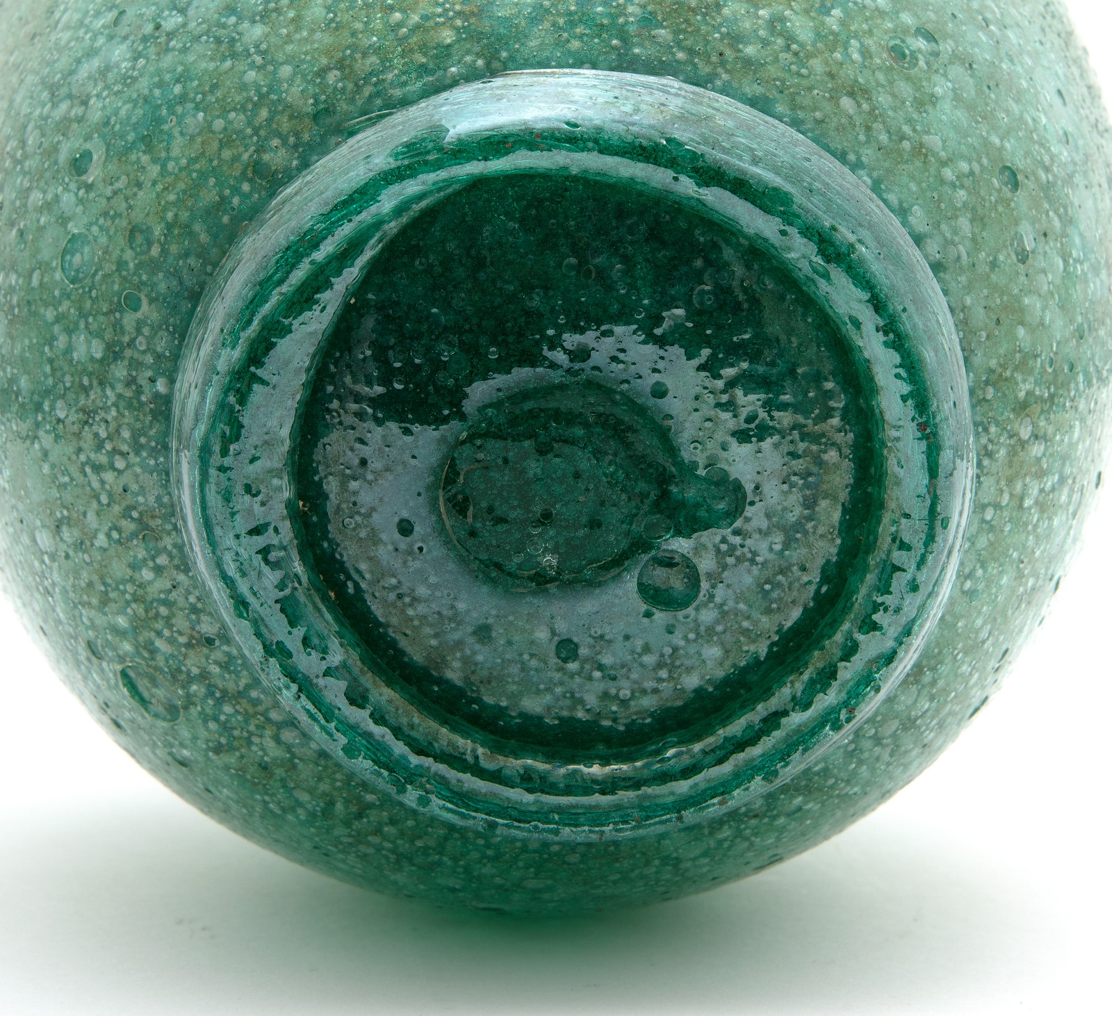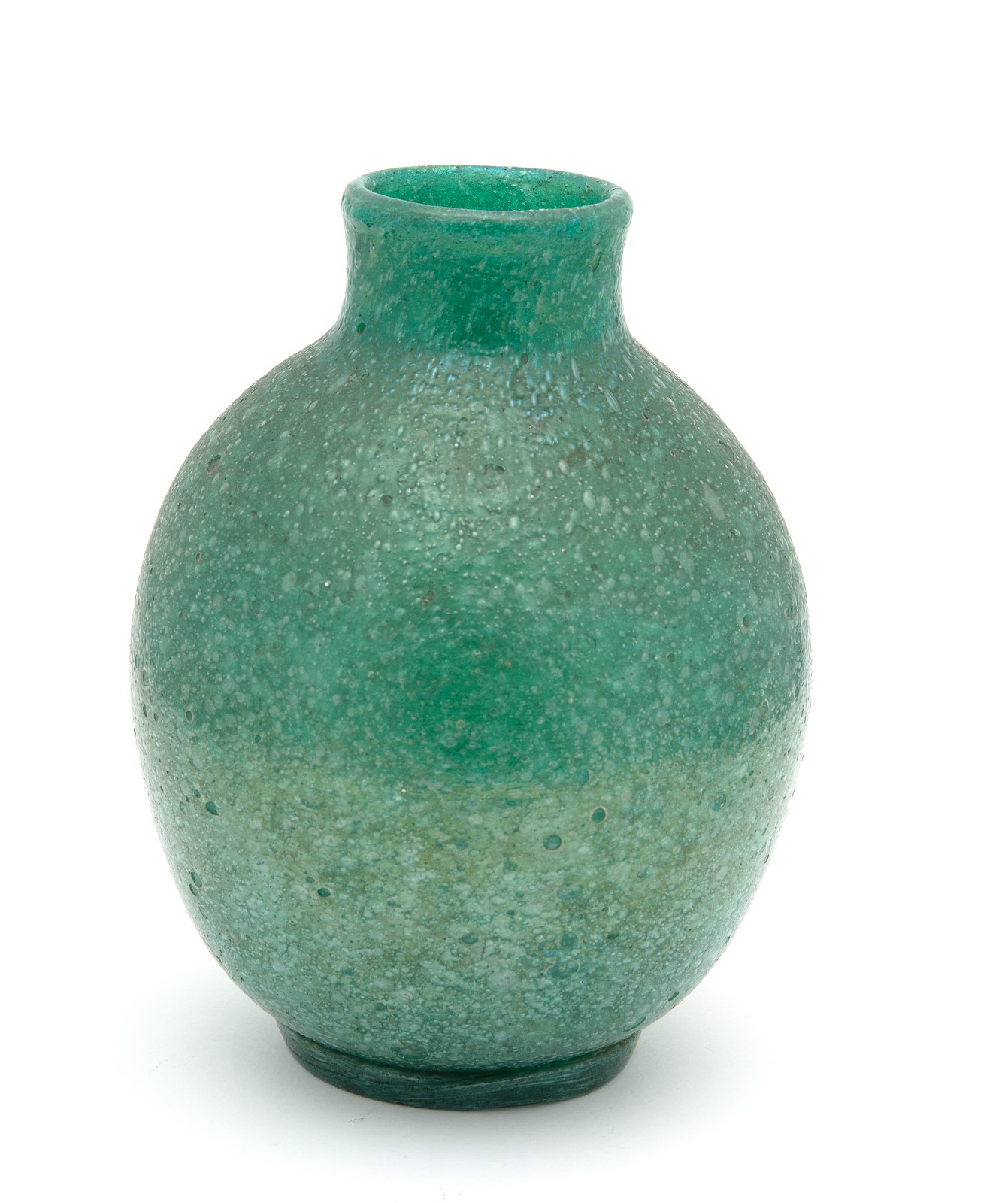 VENINI Vase. . Cm 15,00 x 20,00 x 15,00. Greenish pulegoso glass, model type 1886, 30s. Given the executive quality, the color and the weight / dimension ratio of the product, it is believed that it can be asserted with reasonable certainty that it is contemporary with the period in which Martinuzzi was artistic director at Venini. It was common practice for new vitreous fabrics to be used on models designed by previous artistic directors. In this case the Zecchin. Publications: Vittorio Zecchin: I vetri trasparenti per Cappelin e Venini, published by Skira, pg. 317