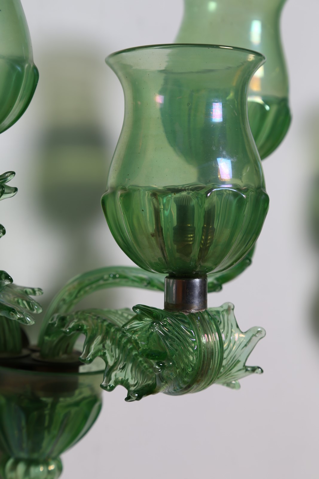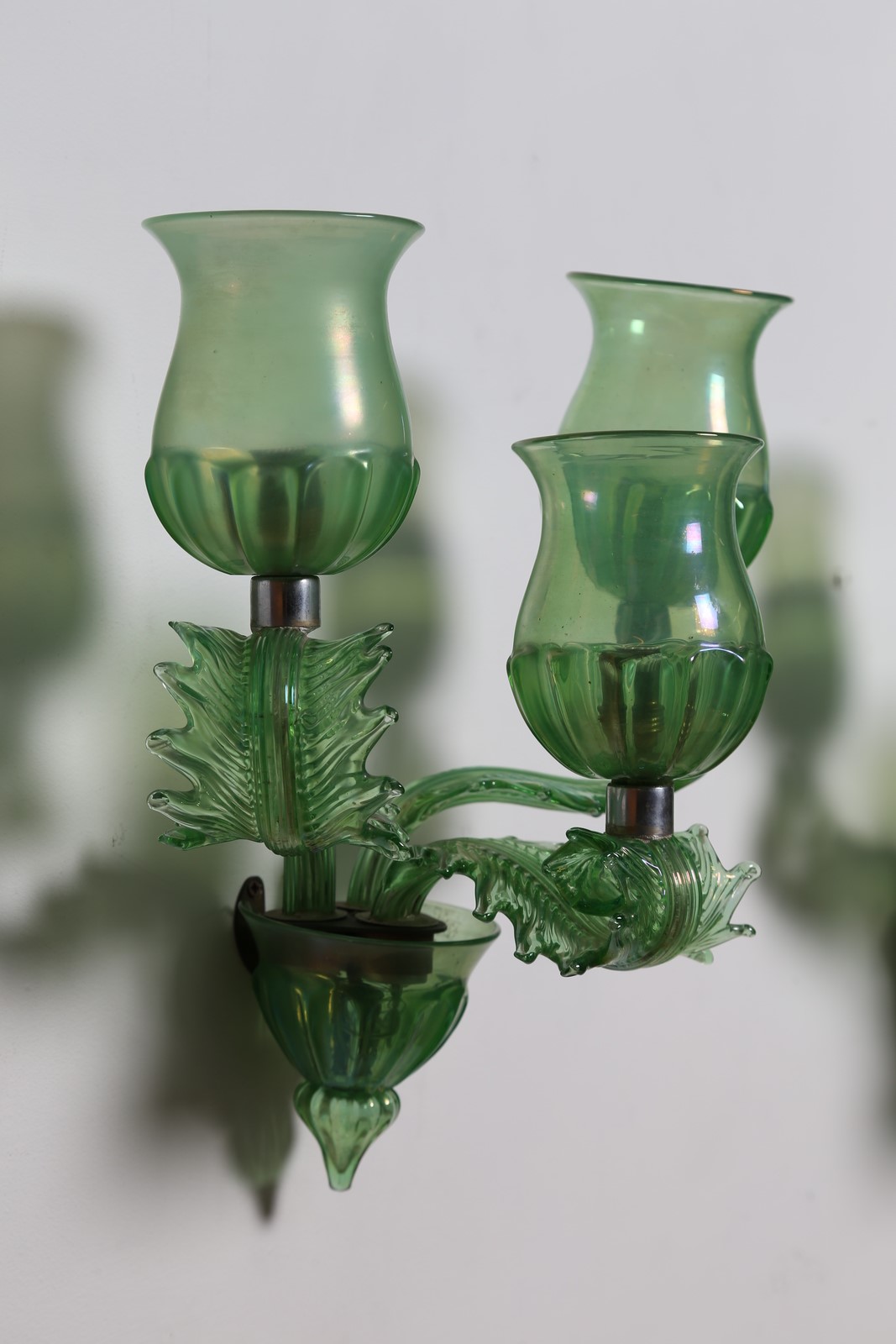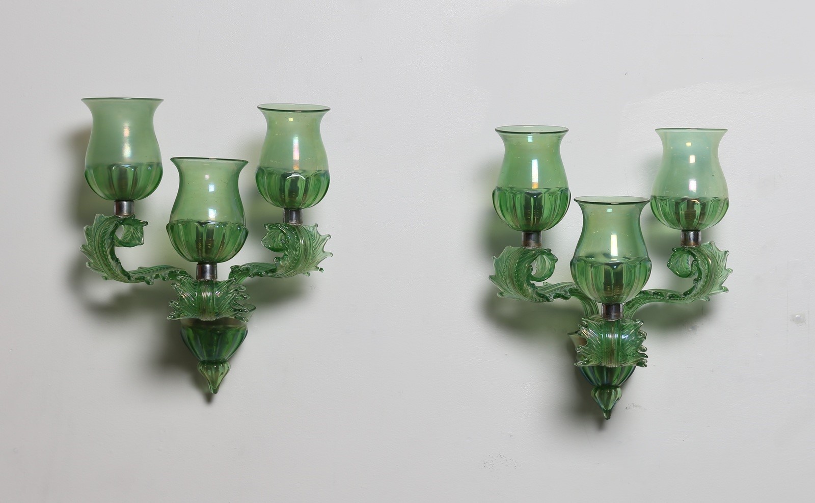 SEGUSO VETRI D'ARTE Coppia di appliques a tre luci. -. . Vetro verde acidato e iridato, coppe lavorate a mezza stampatura, anni 40.