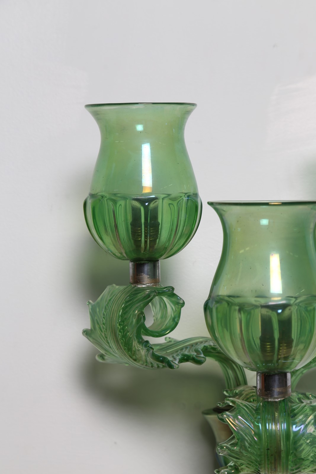 SEGUSO VETRI D'ARTE Coppia di appliques a tre luci. -. . Vetro verde acidato...
