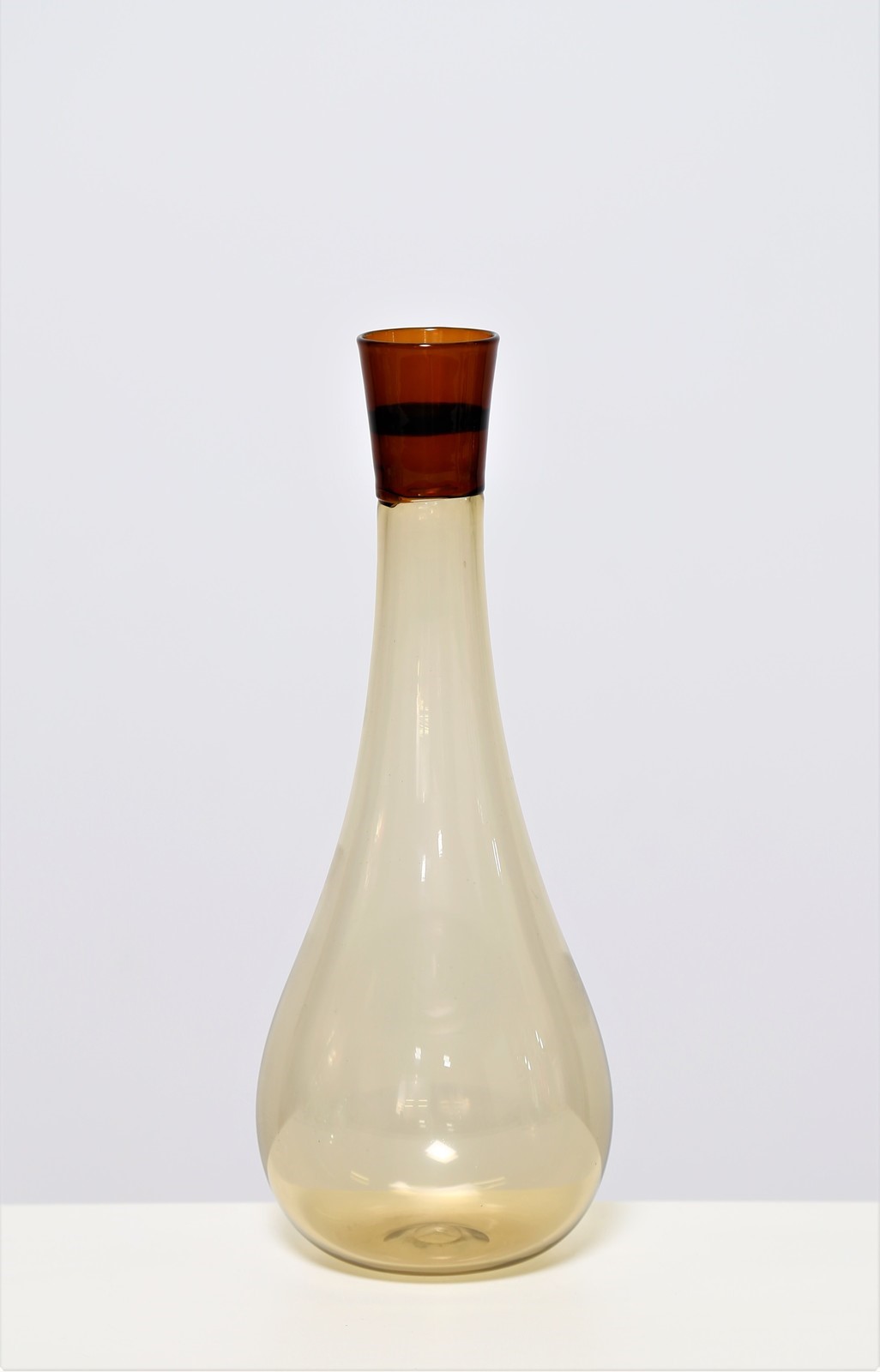 . -. Cm 11,00 x 31,00 x 11,00. Vetro soffiato color pagliesco con collo a incalmo color the e fascia scura centrale, della serie “Colletti” per Venini 1961. Modello numero 512.3. Pubblicazioni: Venini catalogo verde pag.25.