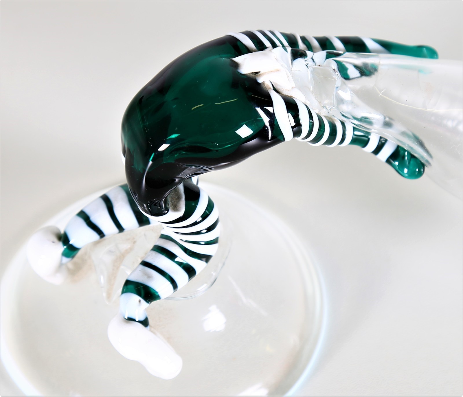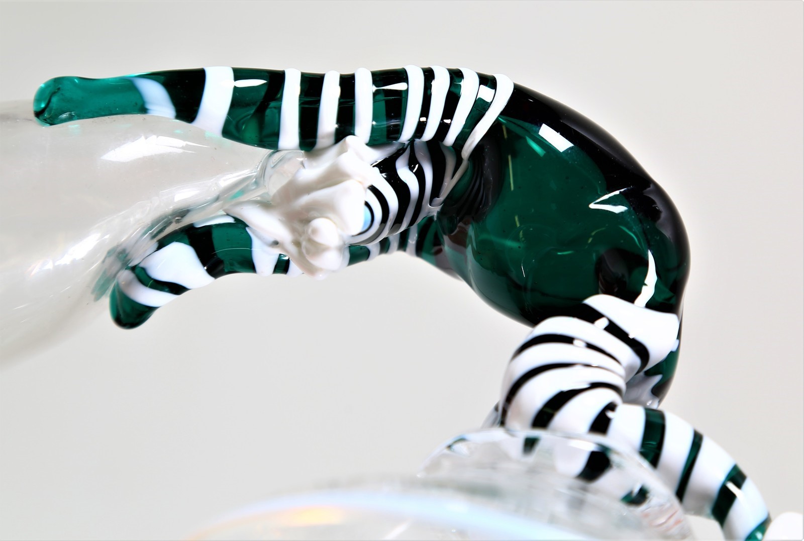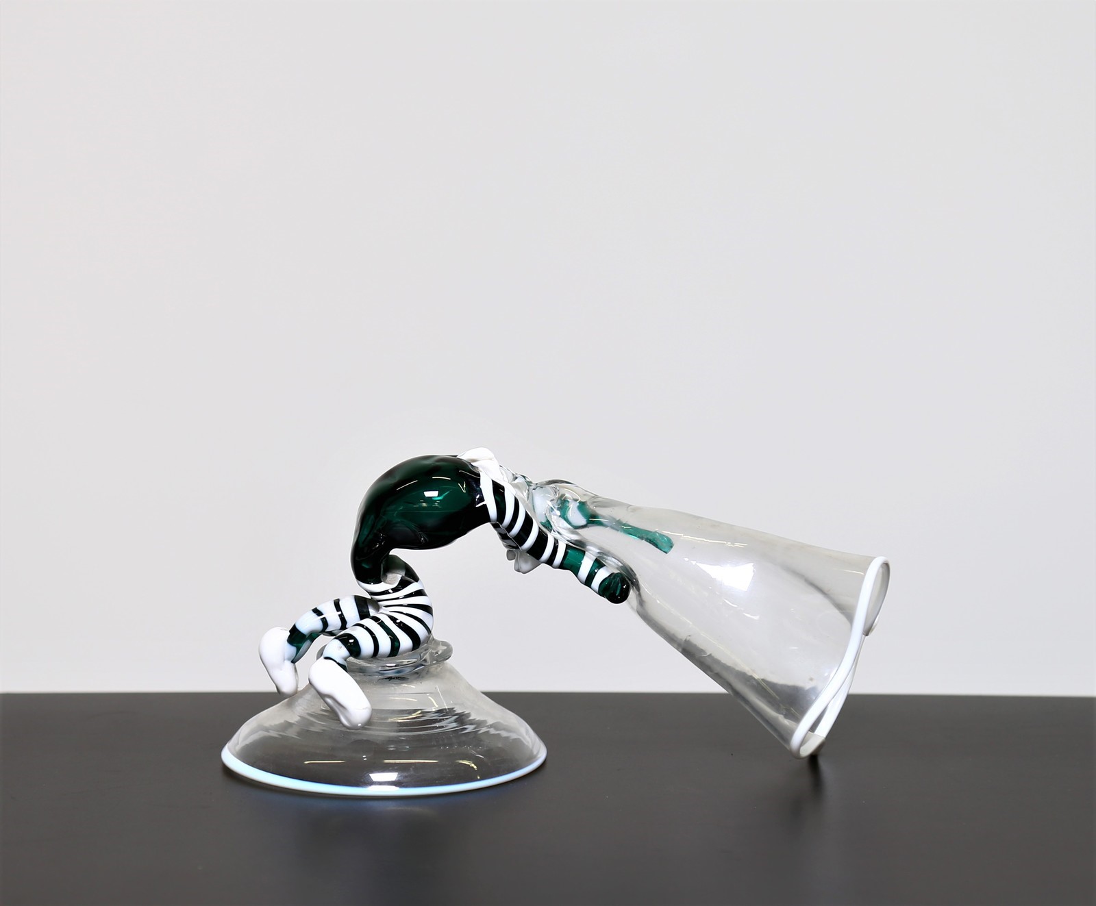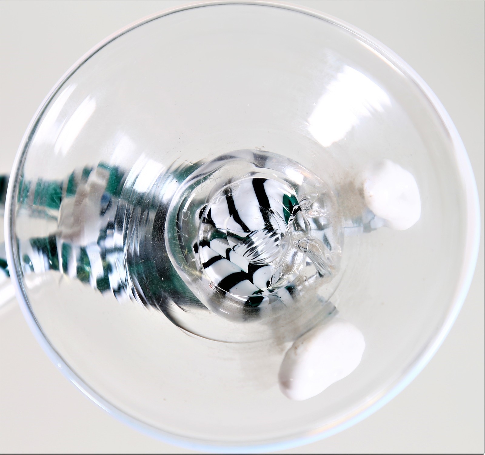 BIANCONI FULVIO (1915 - 1996) Stem glass. . Cm 20,00 x 9,50 x 9,50. Colourless and green blown glass with milk glass applications, from the "Colpi di vento" series for Toso Vetri D'Arte, 1982. Publications: "L’arte del vetro a Murano" by Attilia Dorigato ed. Arsenale, pg. 355.