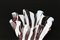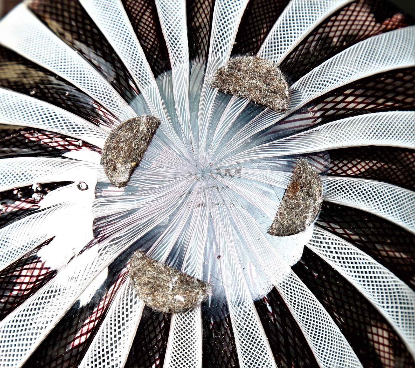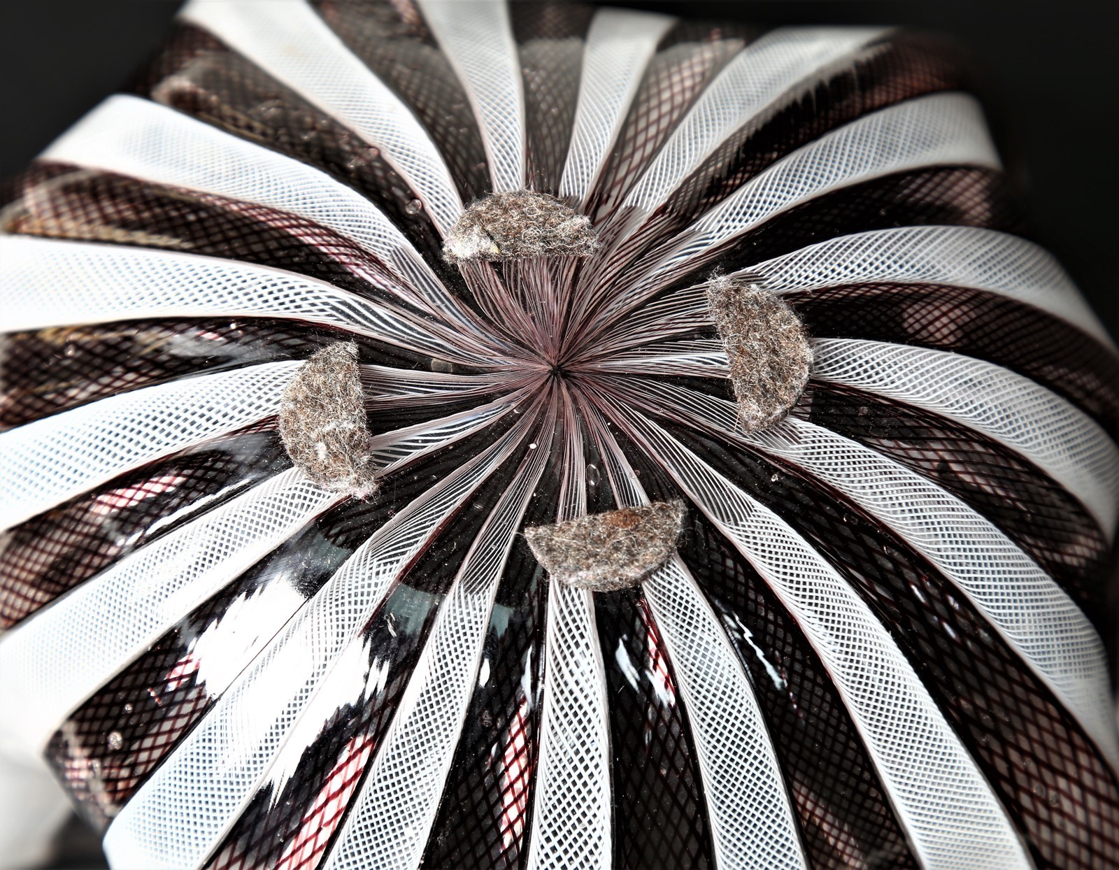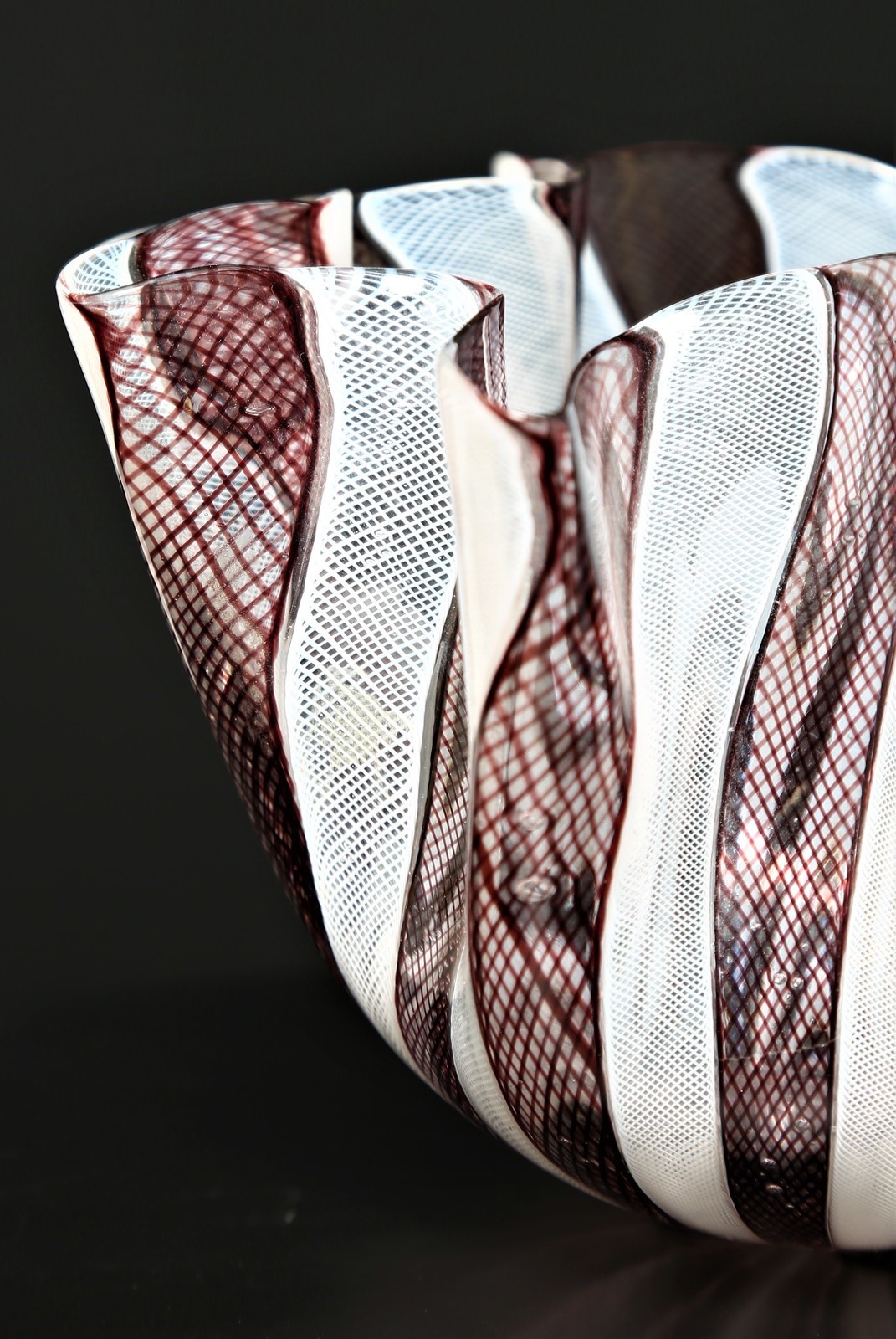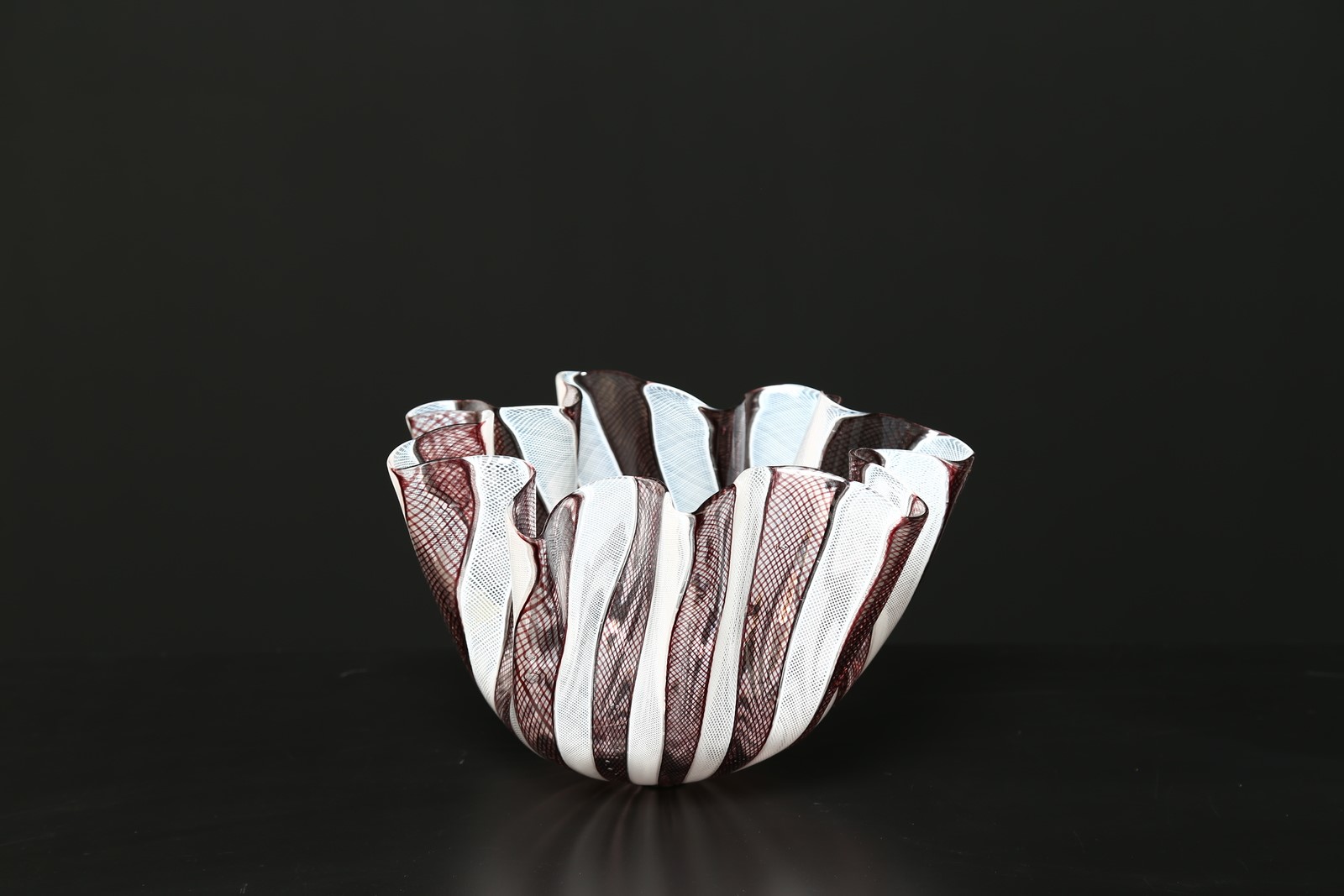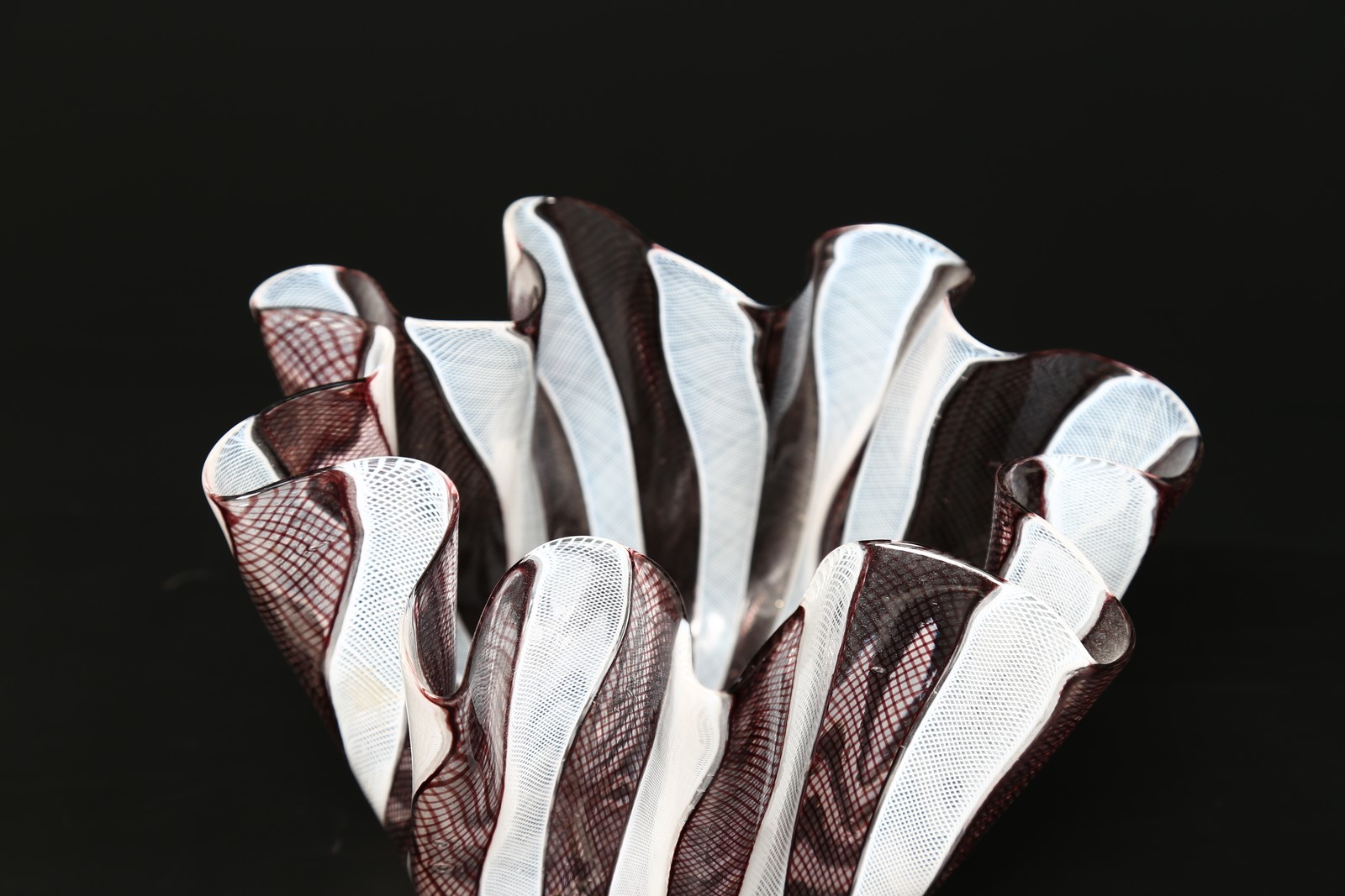 BIANCONI FULVIO (1915 - 1996) Vase. . . Cm 22,00 x 13,00 x 19,00. Vase with alternating rods of reticello milk glass and amethyst glass, model in which the rims develop on a plane, "Fazzoletti" series for Venini, 1950s. Acid etched signature on the base: "Venini Murano Italia".