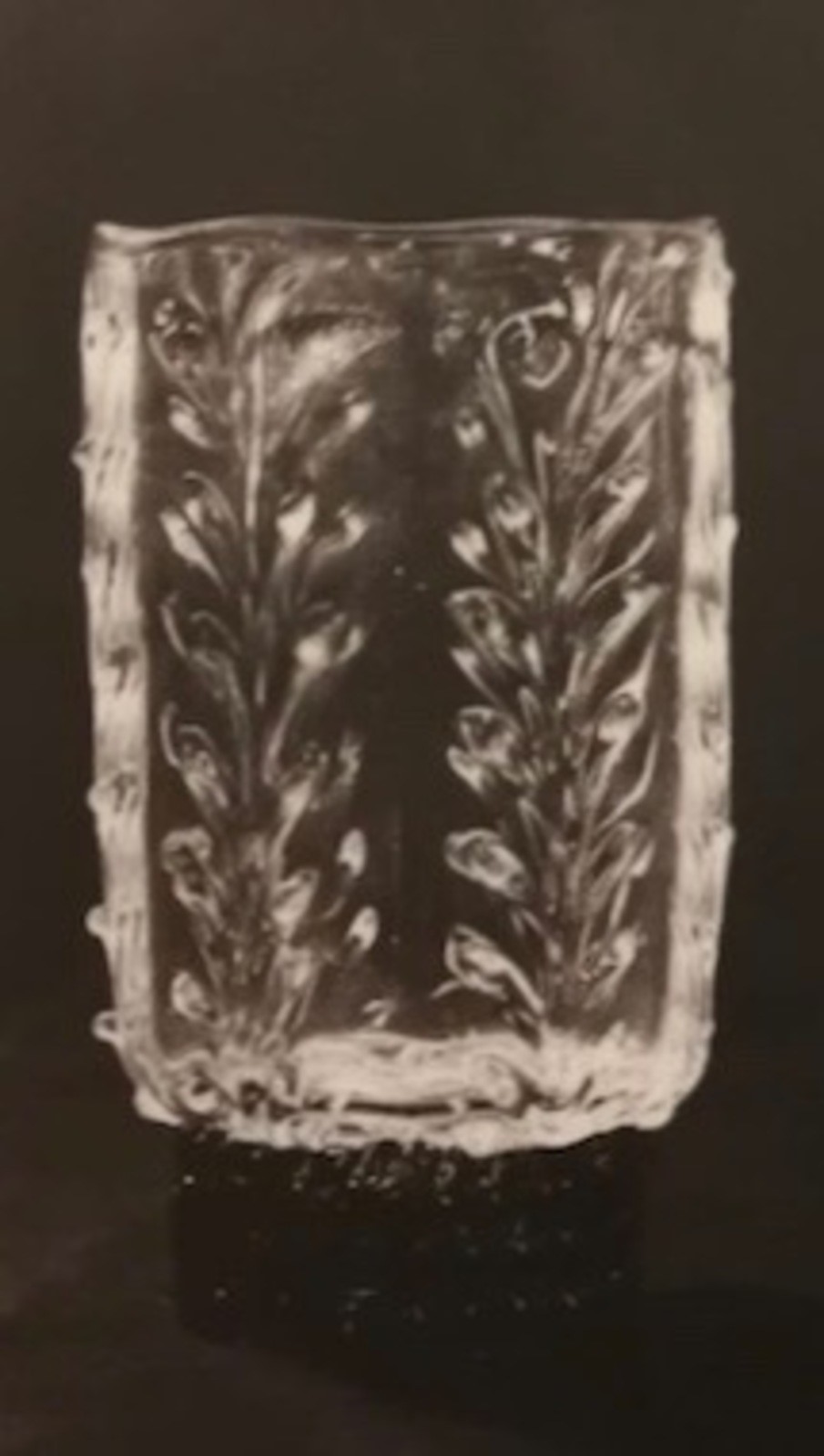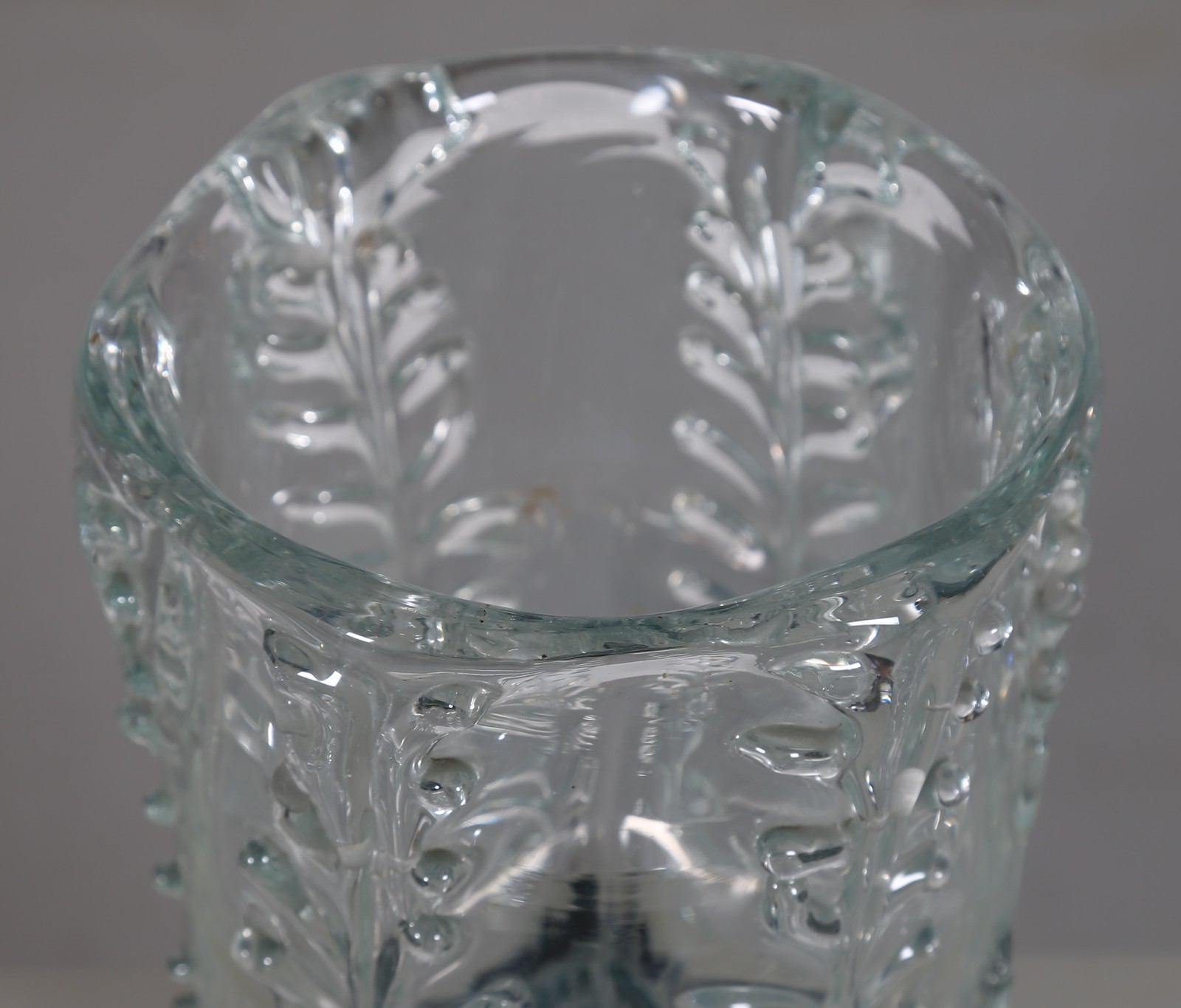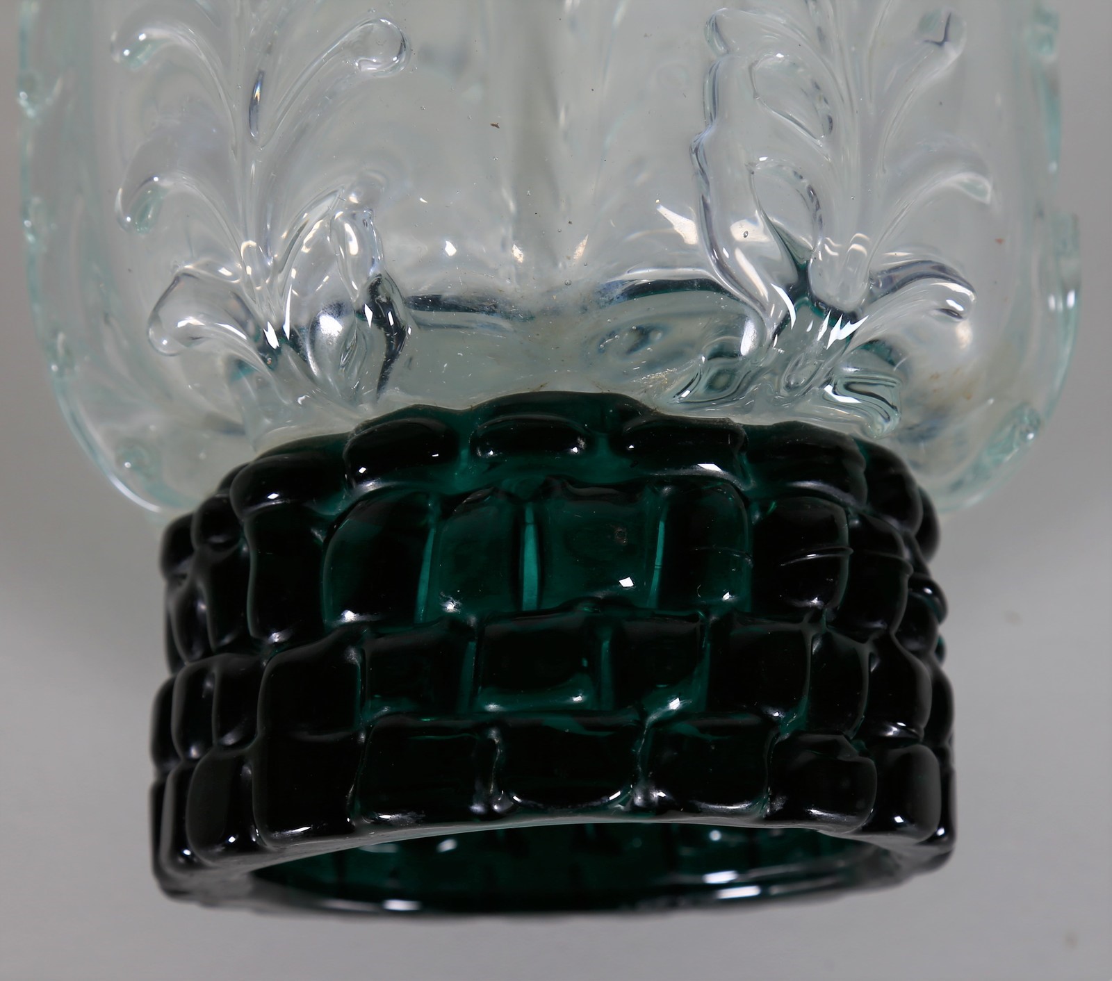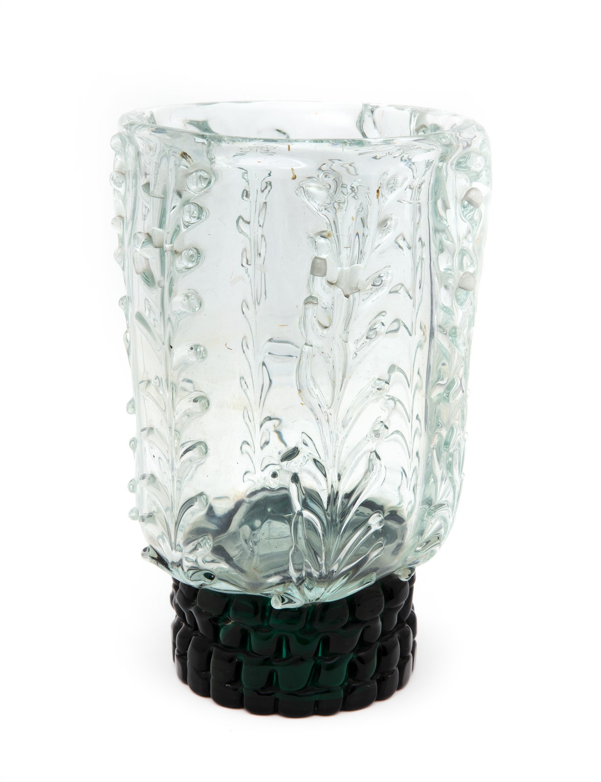 BUZZI TOMASO (1900 - 1981) Coppa. -. Cm 17,50 x 26,50 x 17,50. Vetro trasparente in rilievo con applicazioni vegetali, base in vetro verde, mod. 3486 per Venini 1933. Pubblicazioni: Tomaso Buzzi alla Venini, di Marino Barovier ed. Skira pag. 316;