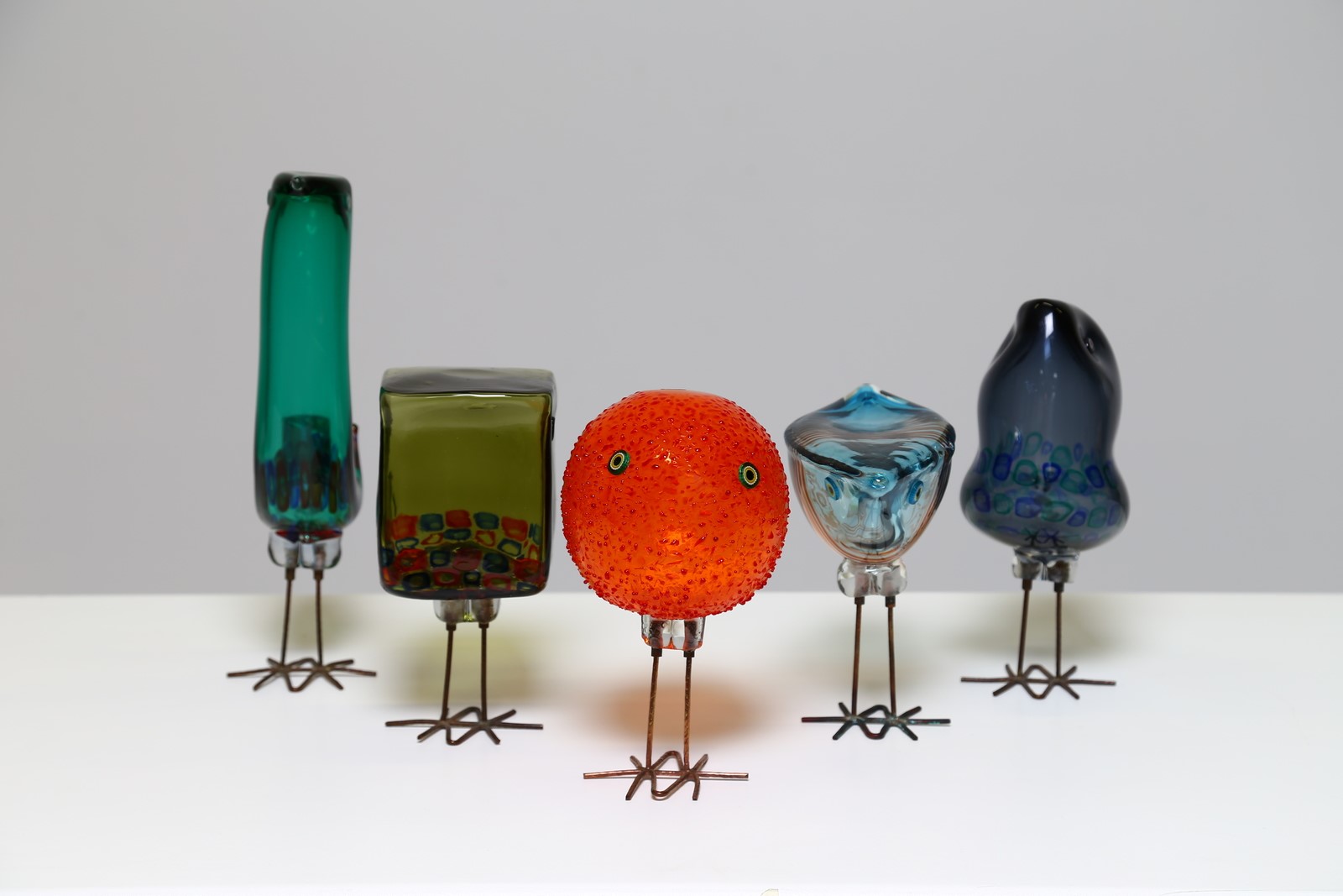 . -. . Vetro soffiato, decorati da schegge, murrine o fili, con zampette in rame, per Vistosi 1961. Presente su due Etichetta originale cartacea. Pubblicazioni: “Il Vetro Veneziano“ di Rosa Barovier Mentasti ed. Arsenale pag.133.