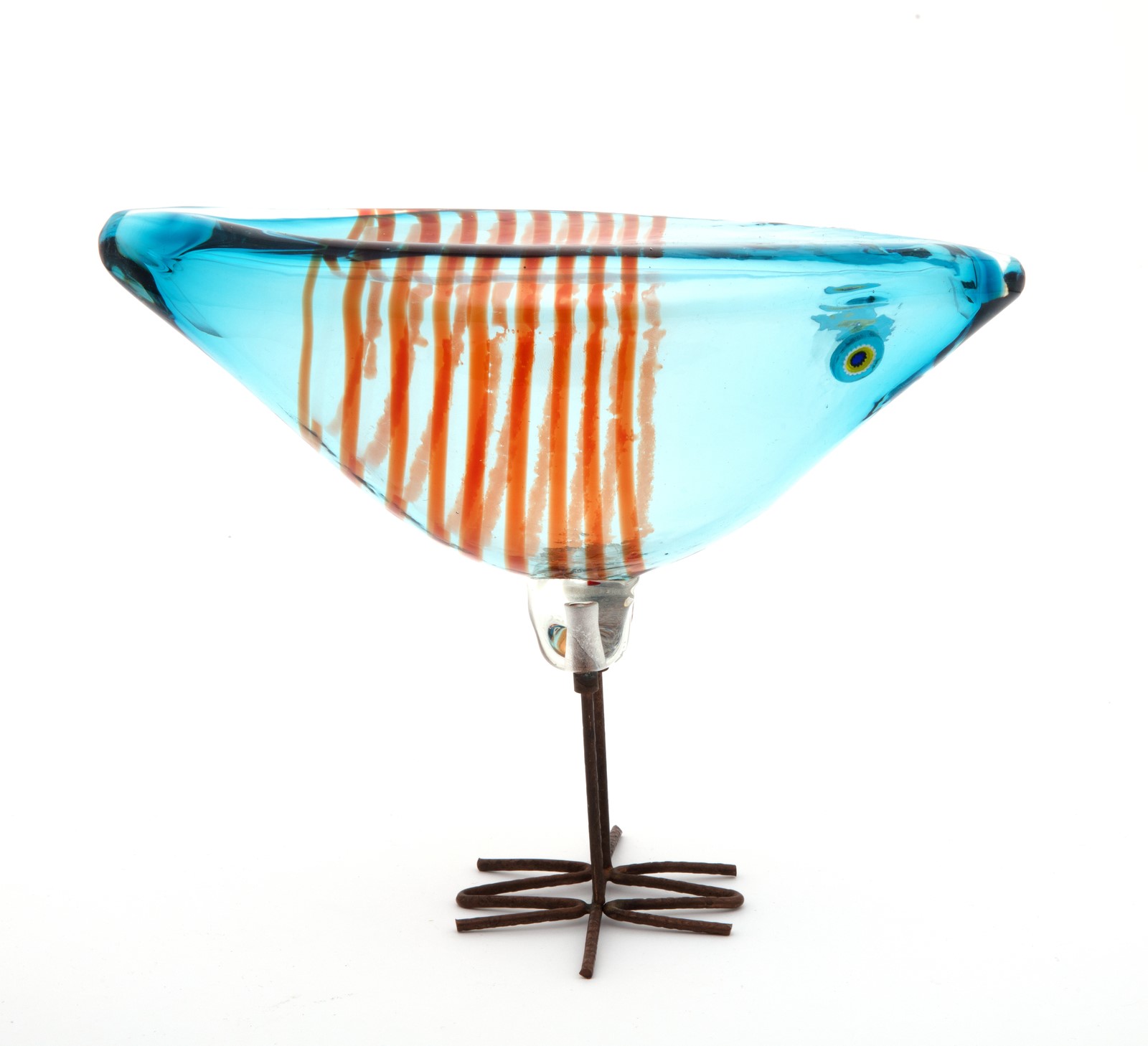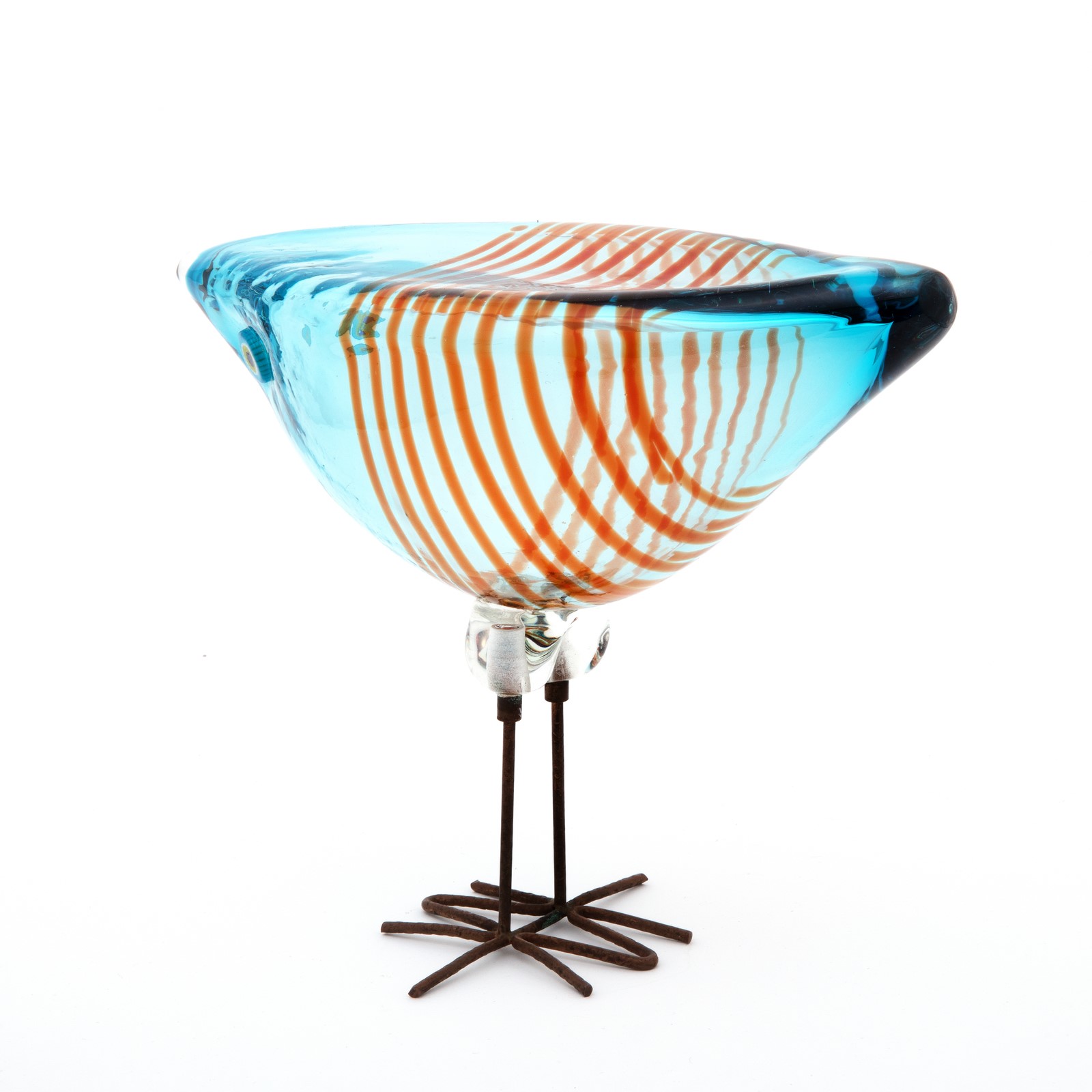PIANON ALESSANDRO Pulcino. . Cm 18,00 x 21,00 x 10,00. Vetro celeste con applicazione filamento arancio, piedini in rame, per Vistosi anni 60. Pubblicazioni: “Il Vetro Veneziano“ di Rosa Barovier Mentasti ed. Arsenale pag.133.