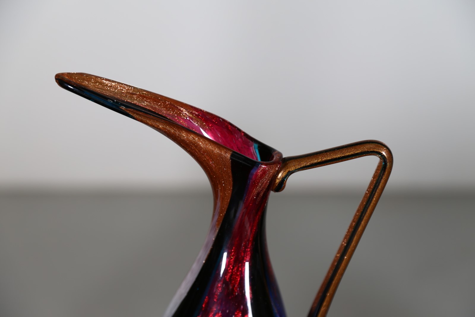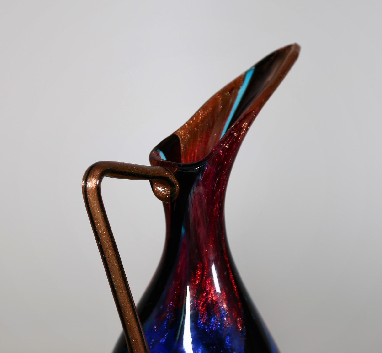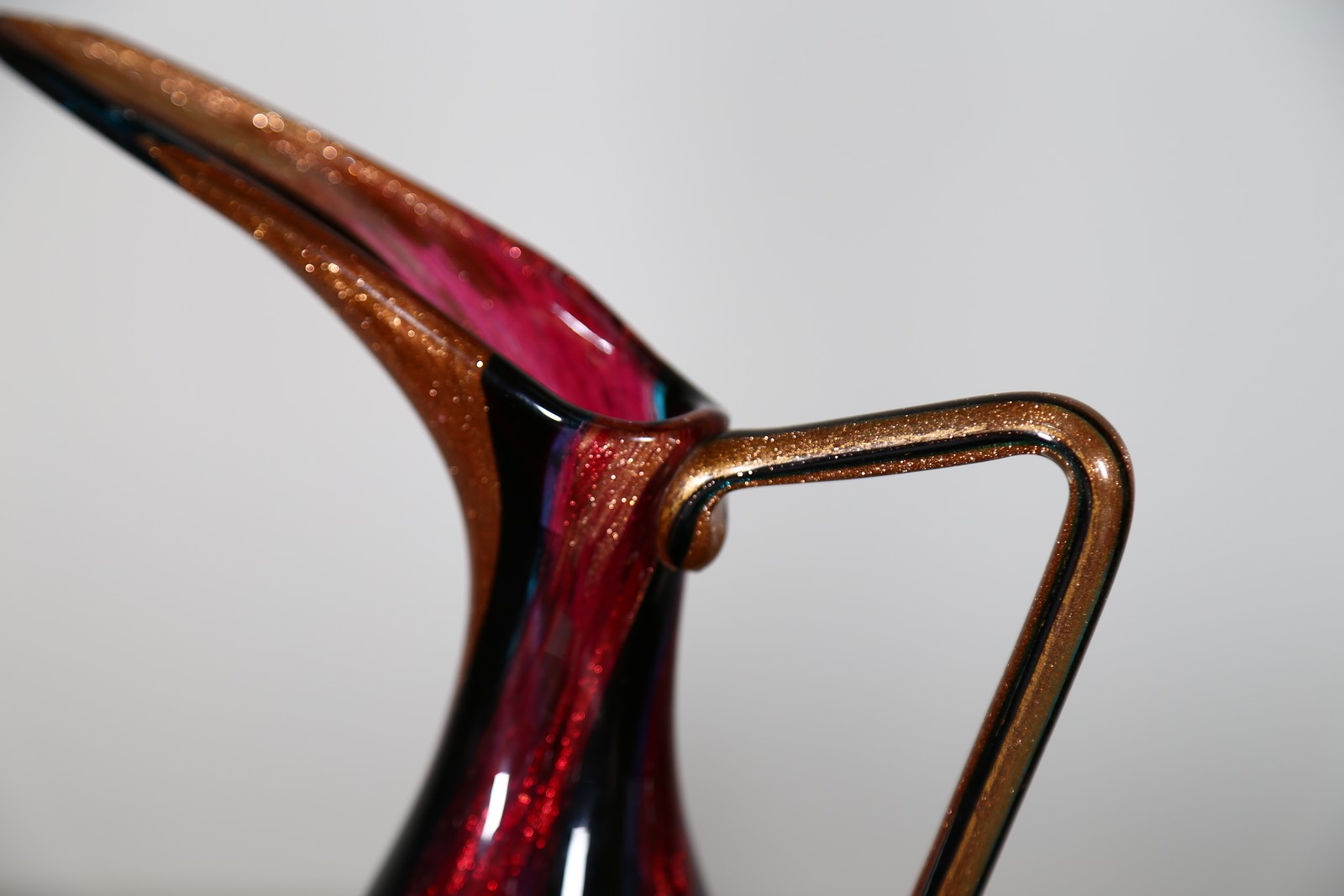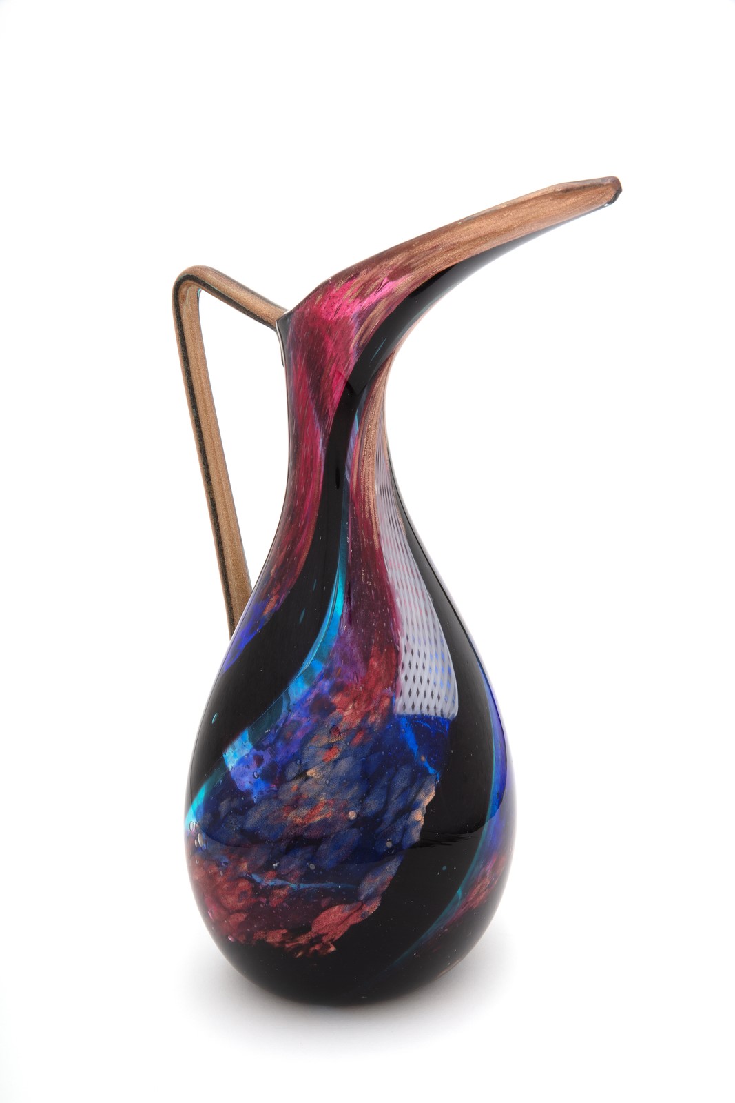 MARTENS DINO (1894 - 1970) "Eldorado" series pitcher. . Cm 25,00 x 35,00 x 15,00. Vase with handle and beak-spouted neck in glass material composed of multi-coloured "granulare" glass, avventurina and inserts of reticello and zanfirico rods, "known as Eldorado for its brilliance", mod. 5212, for Aureliano Toso, 1952, exhibited at the XXVI Biennale. Publications: Il Vetro di Murano alle Biennali 1895-1972, by Marina Barovier, Rosa Barovier Mentasti, Attilia Dorigato, pg. 73 ; L'arte del vetro a Murano by Attilia Dorigato, Ed. Arsenale, pg. 315 ; Dino Martens by Marc Heiremans, Ed. Arnoldsche, pg. 164.