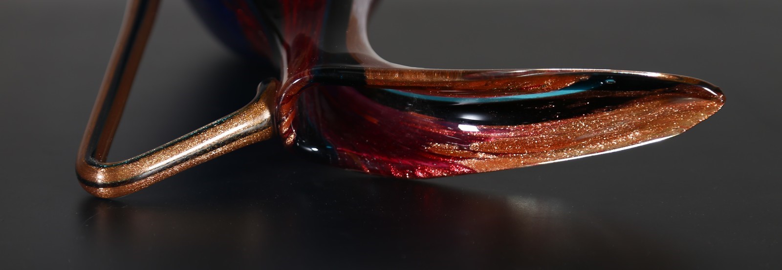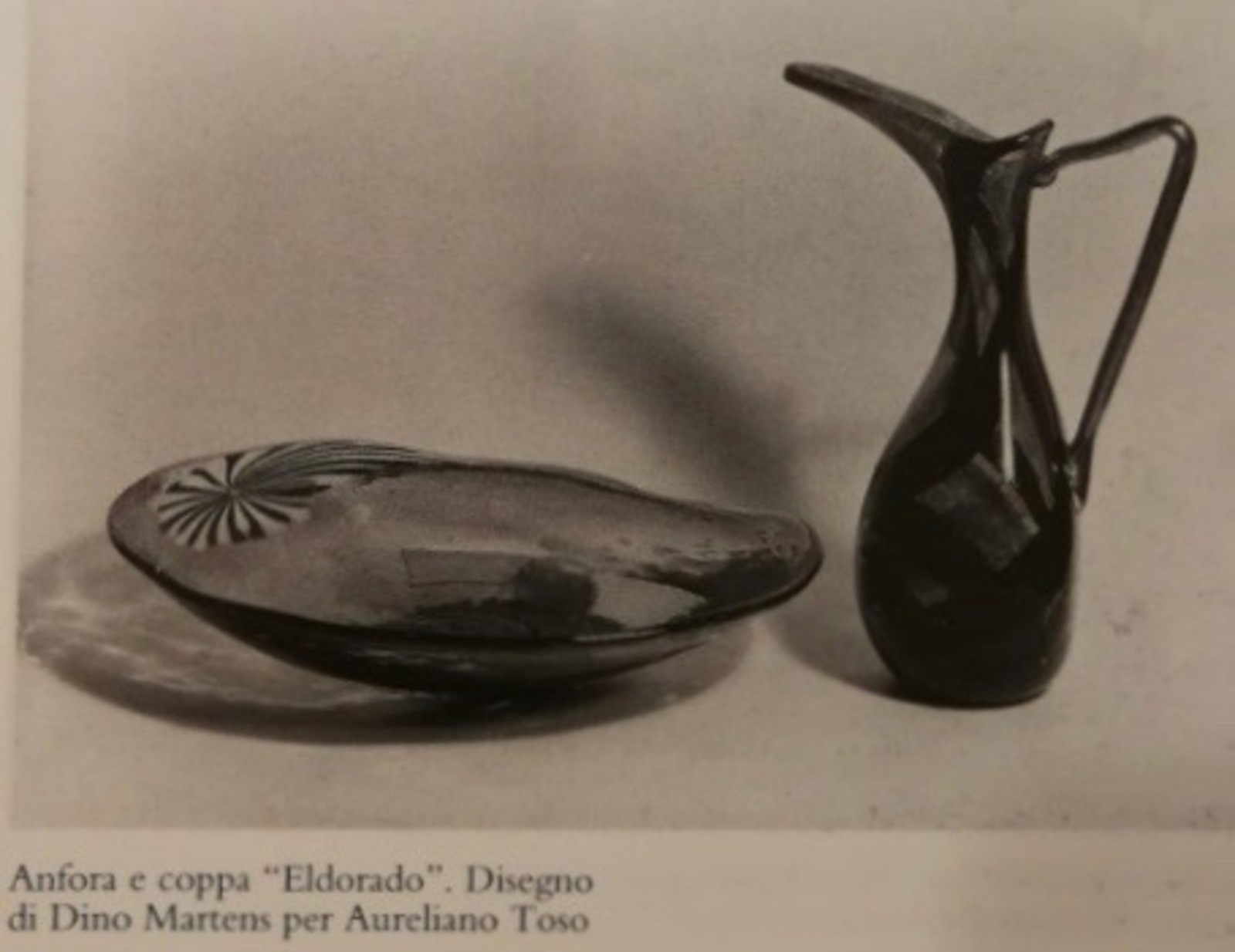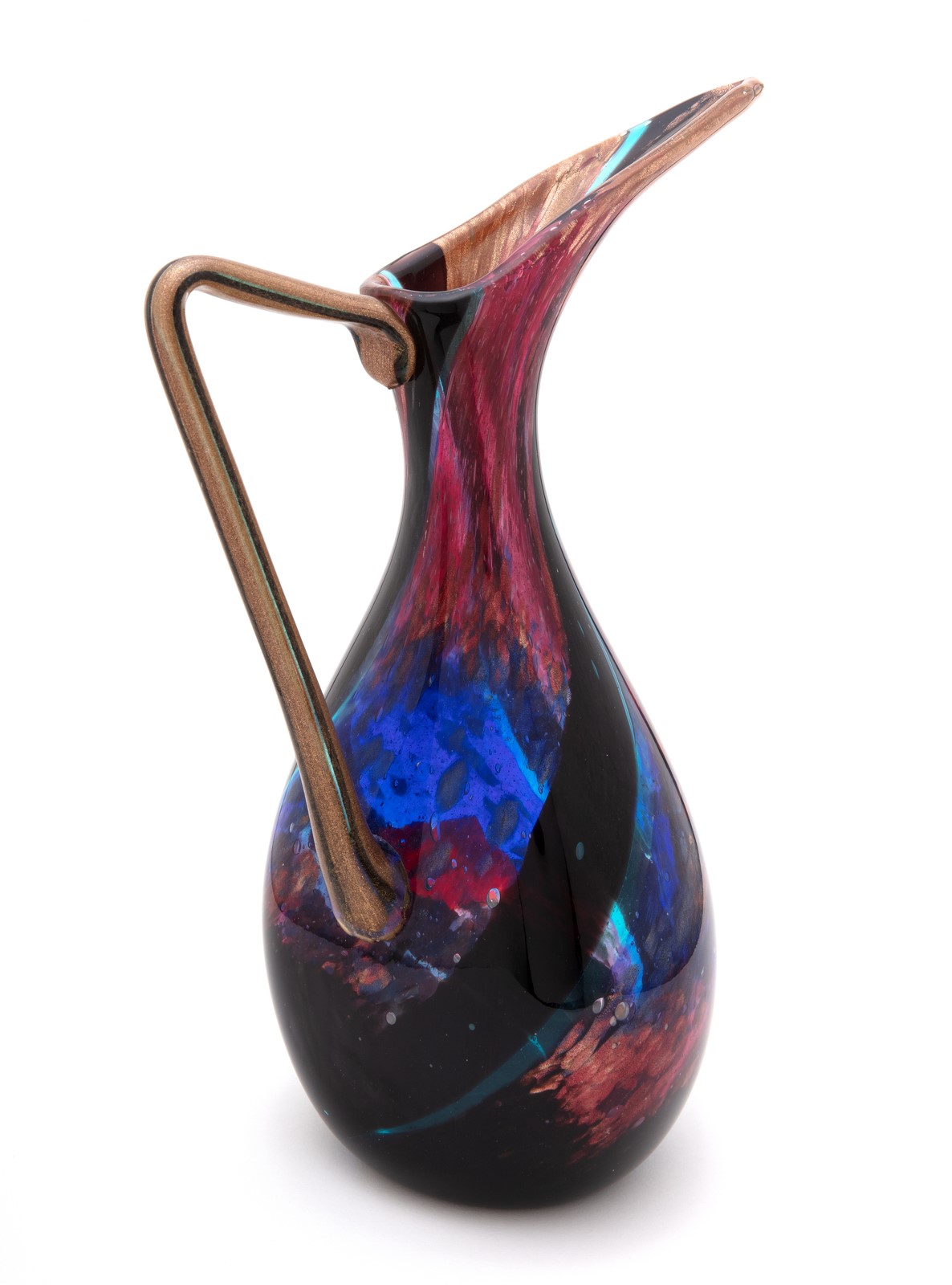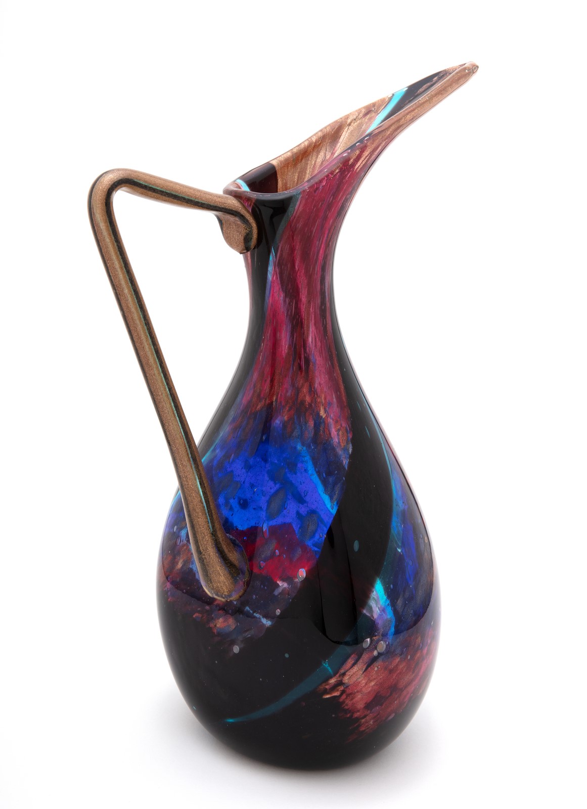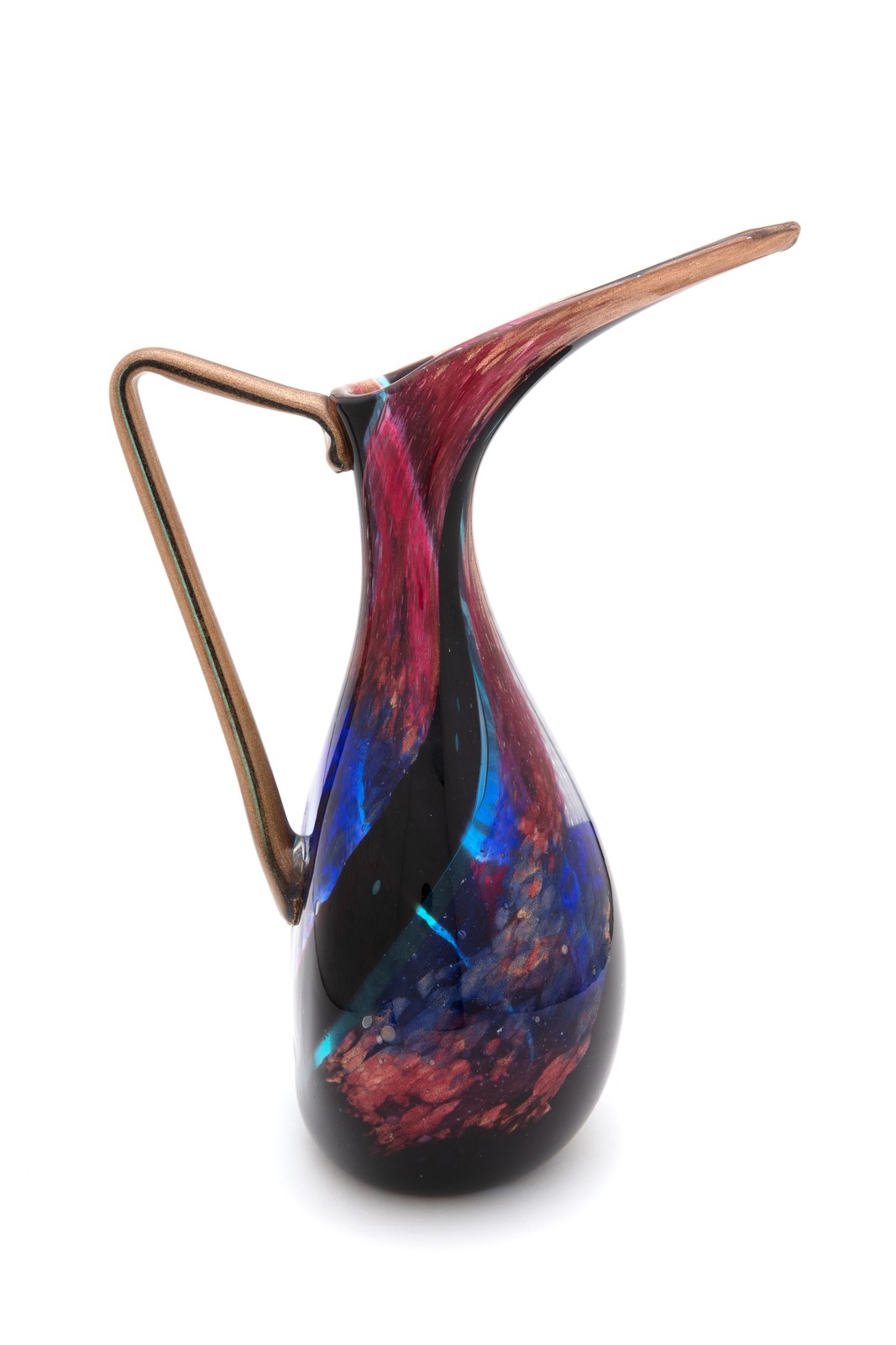 MARTENS DINO (1894 - 1970) Brocca serie Eldorado. -. Cm 25,00 x 35,00 x 15,00. Vaso con ansa e collo a becco in tessuto vitreo composto da graniglia di vetro policroma, avventurina e inserti di canne di reticello e zanfirico, definito "Eldorado" per la brillantezza, mod. 5212, per Aureliano Toso, 1952, Esposizione XXVI Biennale. Pubblicazioni: Il Vetro di Murano alle Biennali 1895-1972, di Marina Barovier, Rosa Barovier Mentasti, Attilia Dorigato, pag. 73; L'arte del vetro a Murano Attilia Dorigato, ed. Arsenale, pag. 315; Dino Martens di Marc Heiremans ed. Arnoldsche, pag. 164.
