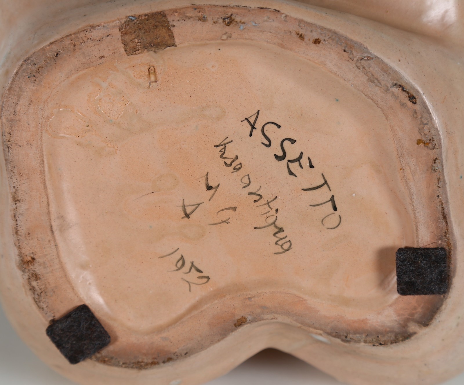 ASSETTO FRANCO Sculptural vase. . Cm 23,00 x 46,00 x 23,00. Carved and painted ceramic, "Antiqua" series. Carved and cold-painted terracotta, a unique piece from a small series of different models, "Antiqua" series for M.G.A. Albissola, 1952. Signature and date on base.