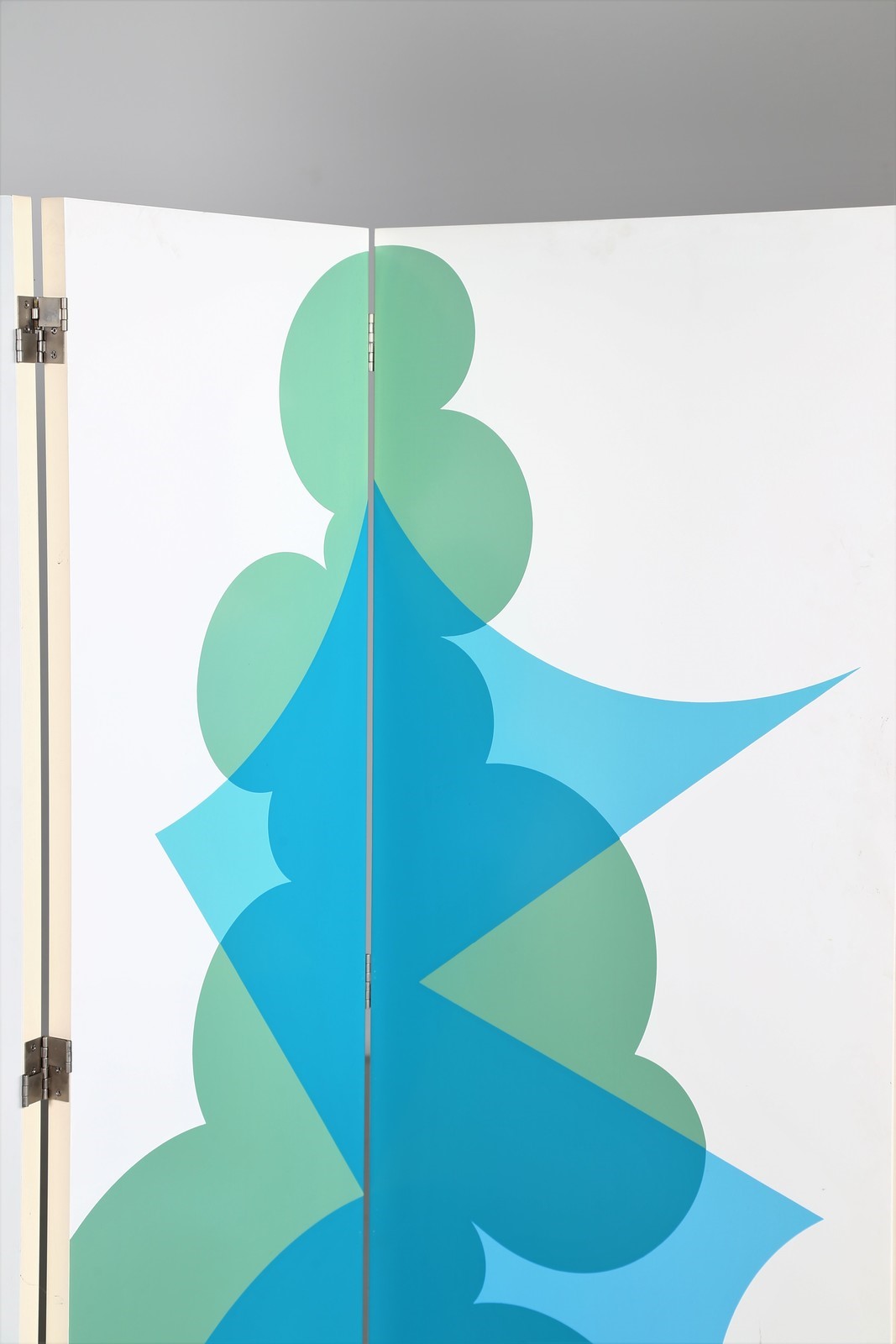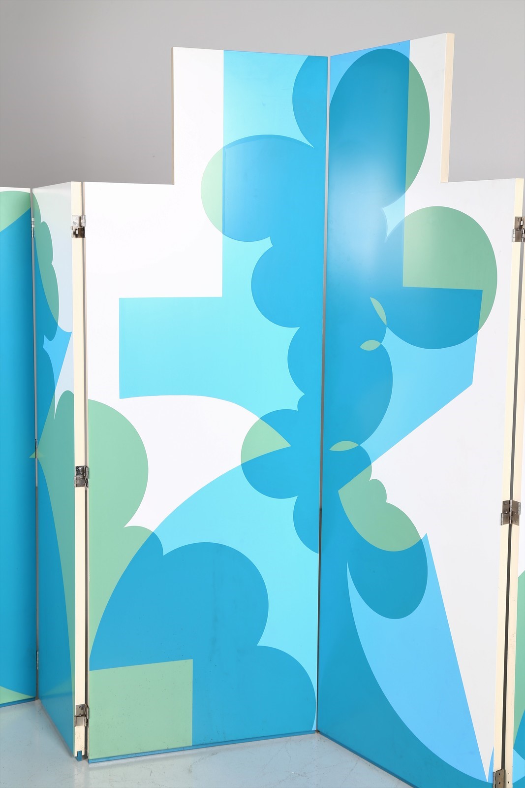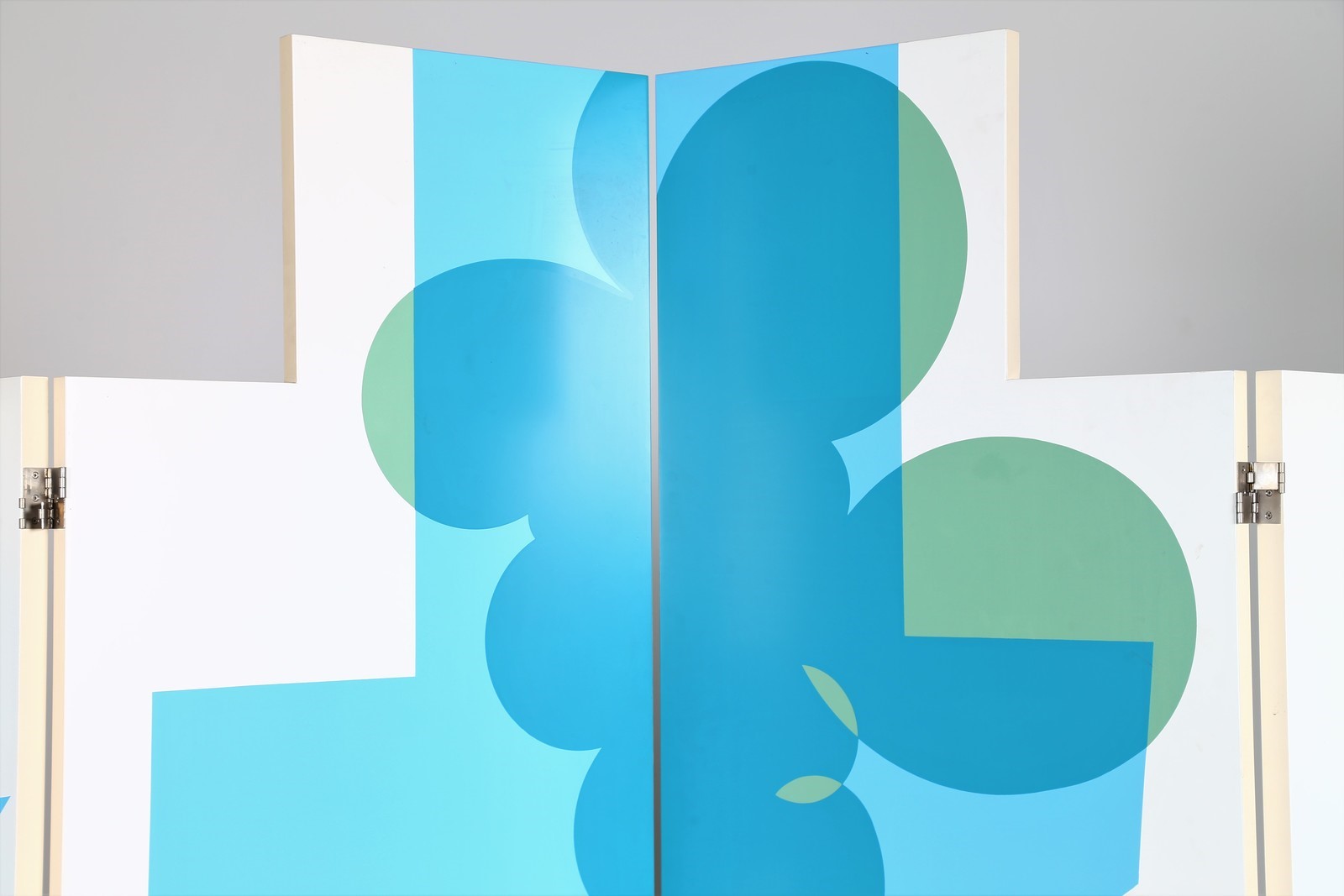 BALLA GIACOMO (1871 - 1958) Screen. . Cm 362,00 x 200,00 x 3,00. Honeycomb core wood panels screen-printed on two sides and brass, for Gavina, 1970s. Publications: Fondazione Scientifica Querini Stampalia, Dino Gavina, Collezioni emblematiche del moderno dal 1950 al 1992, pg. 94, Jaca Book, 1992.