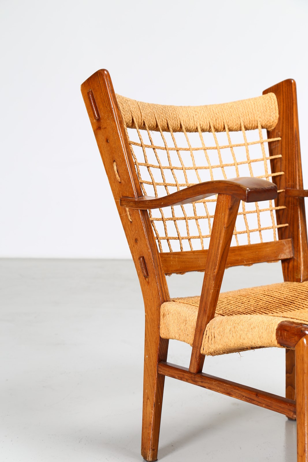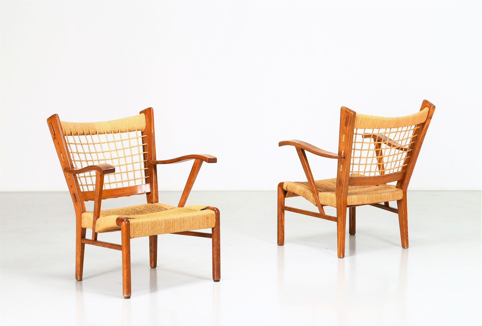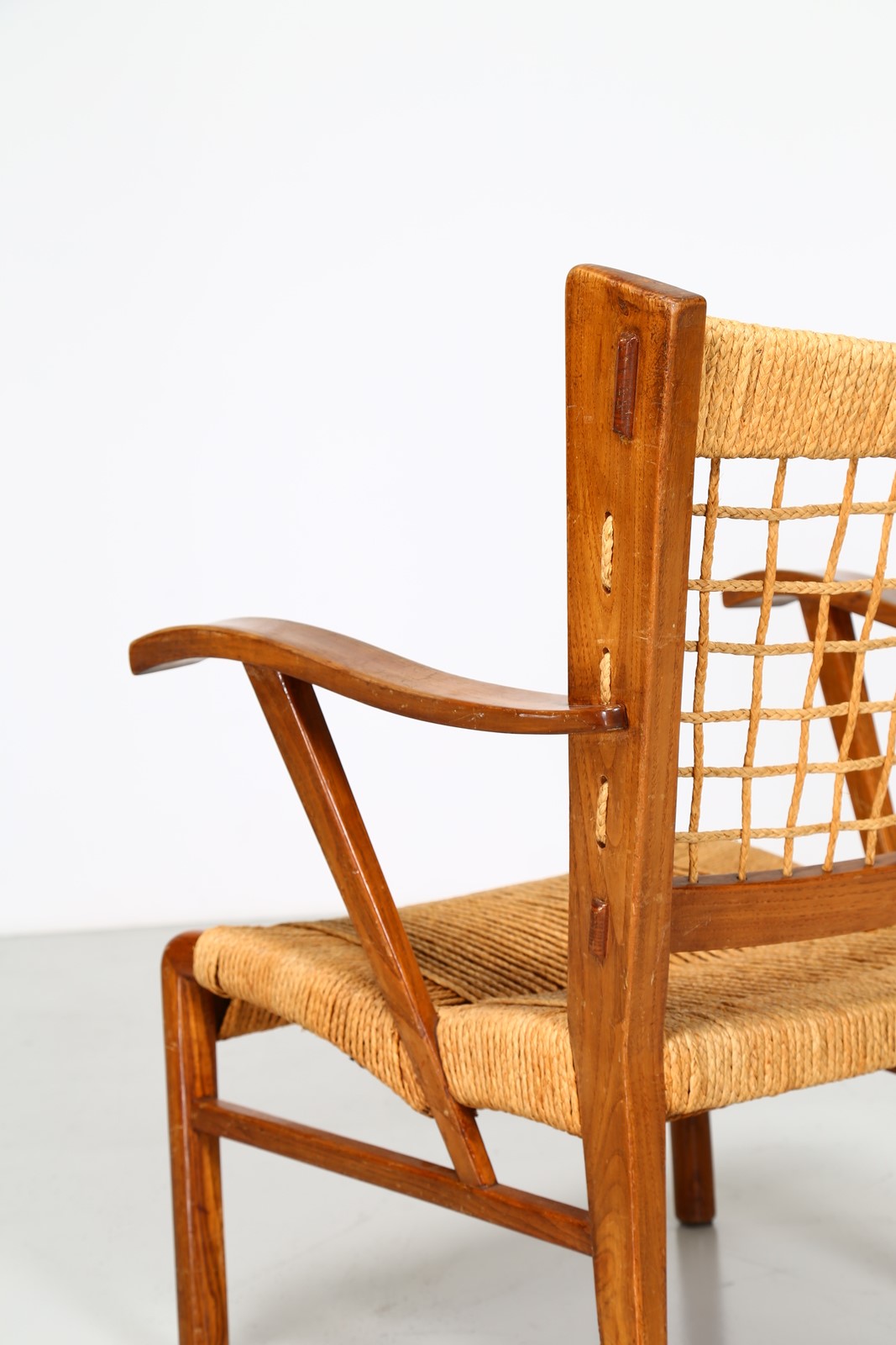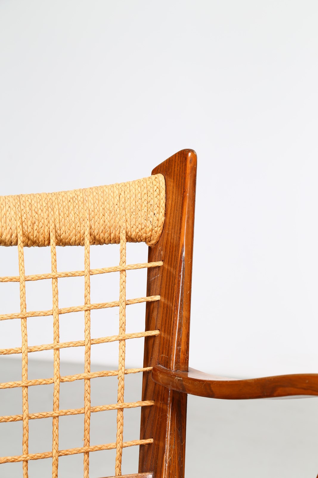 PECORINI GUGLIELMO Pair of armchairs. . Cm 65,50 x 86,00 x 71,00. Walnut and rope, "Edizioni I Due Forni", from the furnishings of Casa Urbano Zaccagnini, Florence, 1935 Domus no. 173, May 1942.