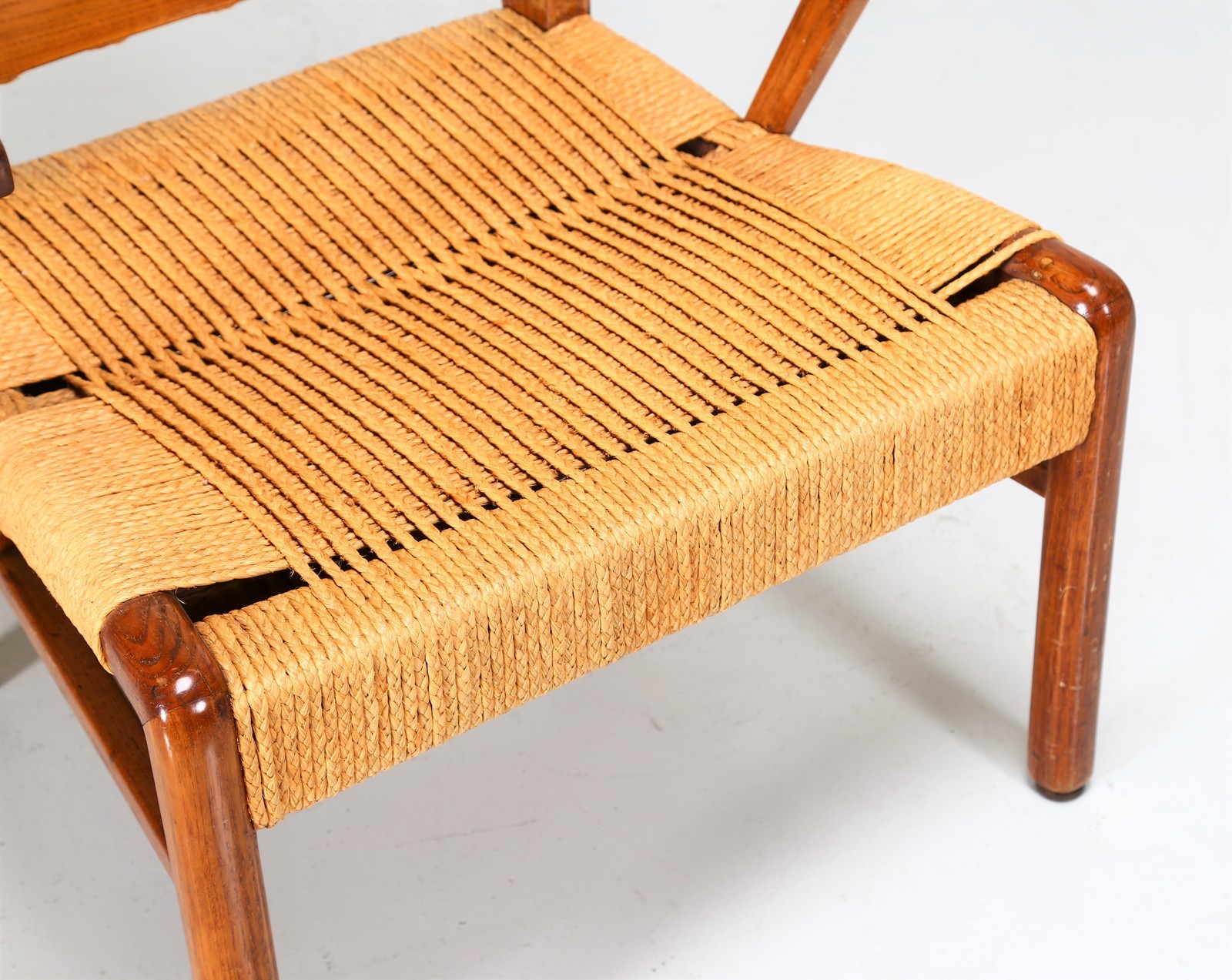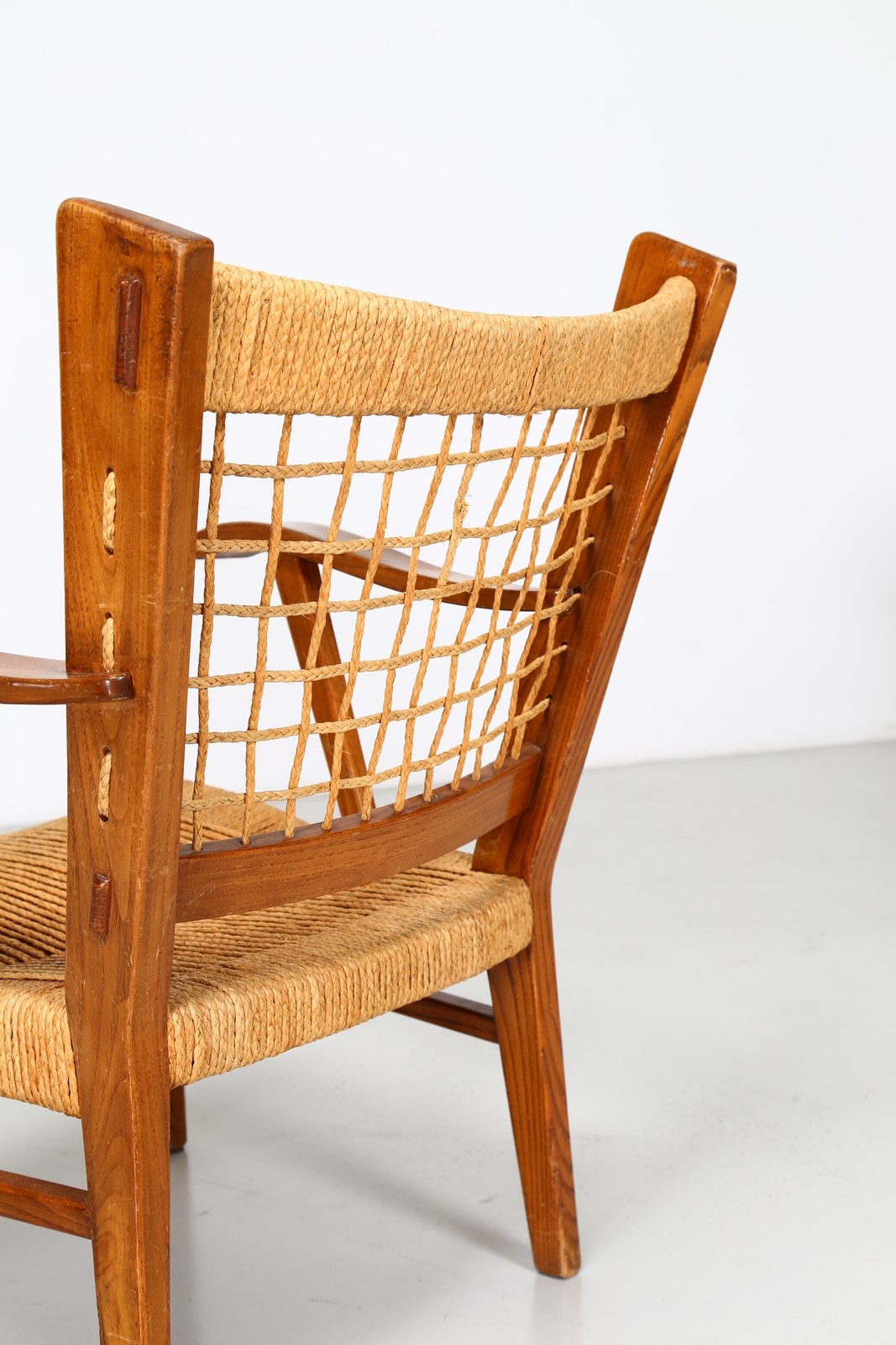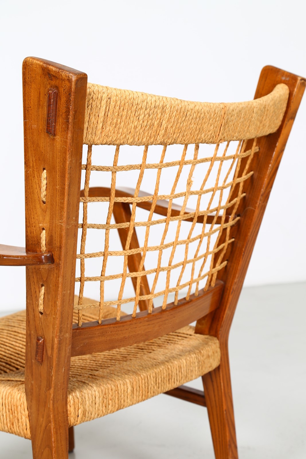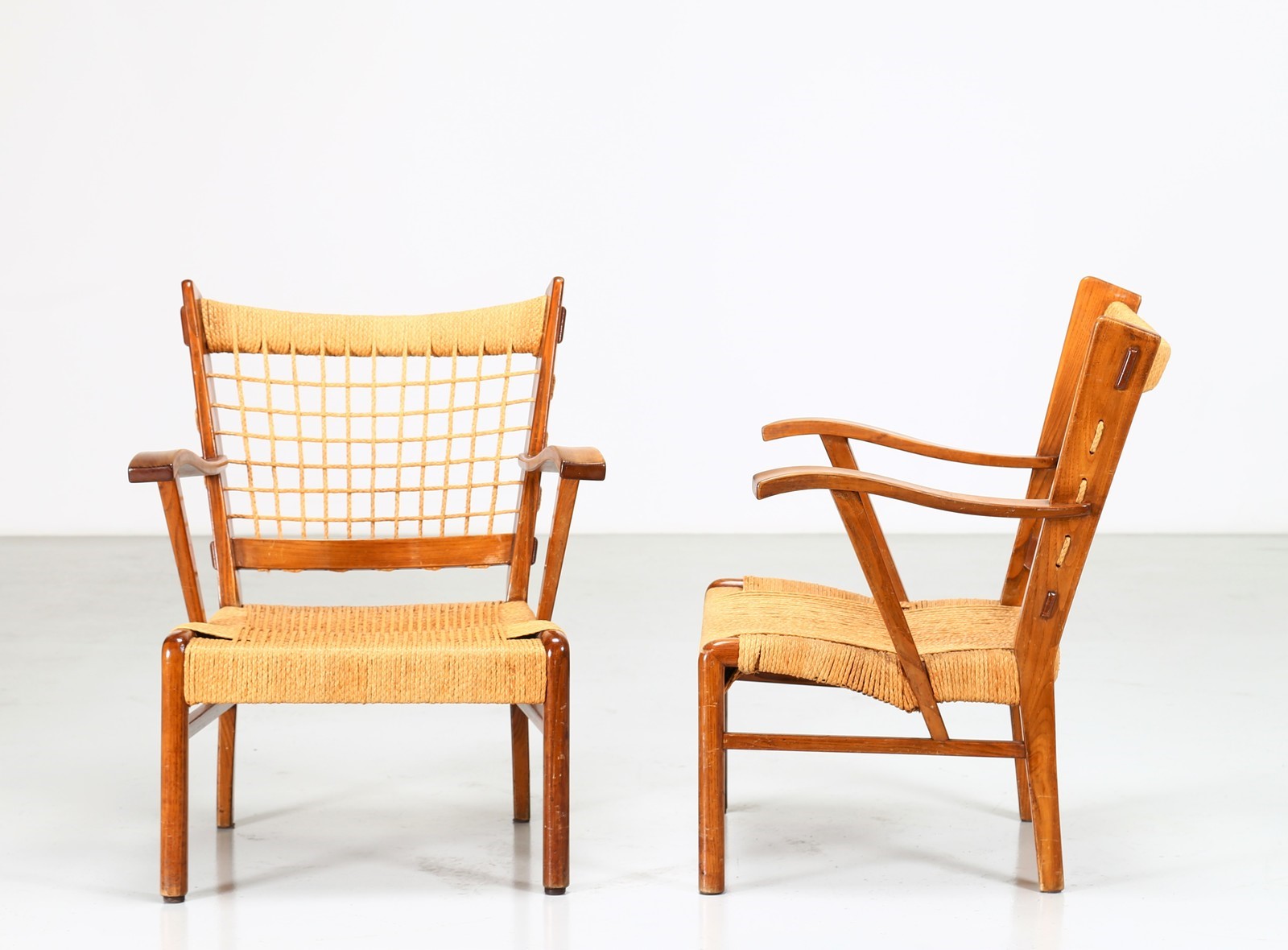 PECORINI GUGLIELMO Pair of armchairs. . Cm 65,50 x 86,00 x 71,00. Walnut and rope, "Edizioni I Due Forni", from the furnishings of Casa Urbano Zaccagnini, Florence, 1935 Domus no. 173, May 1942.