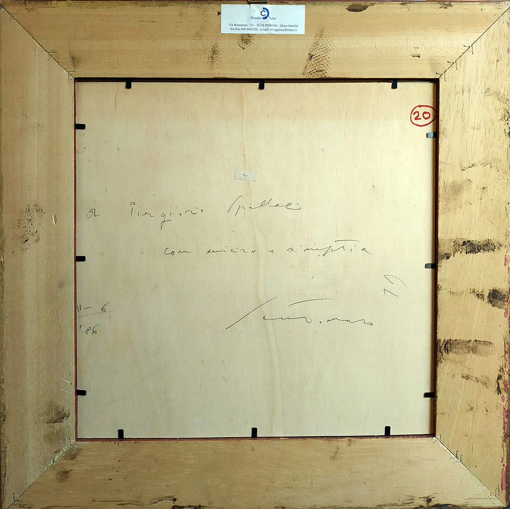 Giuseppe Santomaso, Senza Titolo, 1980 ca. Tecnica mista su carta 21,7x20x5 cm Firma a retro e, a fronte, in basso a destra Certificato di autenticità su foto rilasciato da GALLERIA BLU - Archivio Giuseppe Santomaso a firma Anna Fontana, in data 1/12/2011 (Milano) N. archivio SCT/2017 Dedica ad personam a retro