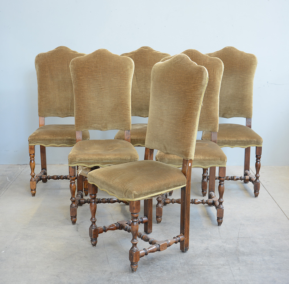 Gruppo di sei antiche sedie imbottite con gambe tornite a rocchetto, rivestite in velluto verde (difetti)