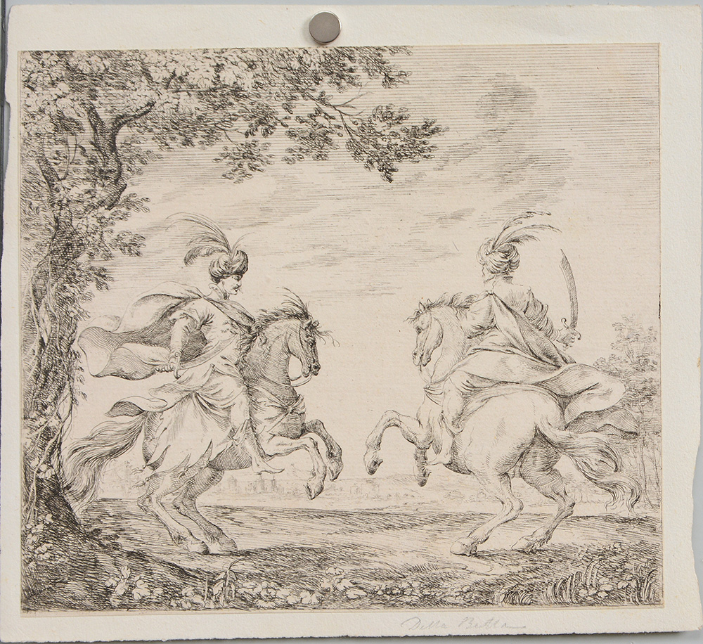 Seguace di Stefano della Bella "Due uomini a cavallo in abiti orientali" acquaforte applicata su cartoncino (mm 160x183)