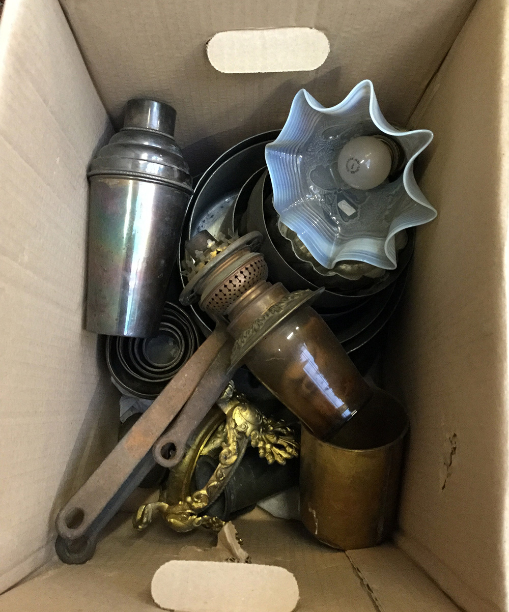 Lotto composto da numerose pentole e oggetti diversi in metallo. In un cartone (difetti)