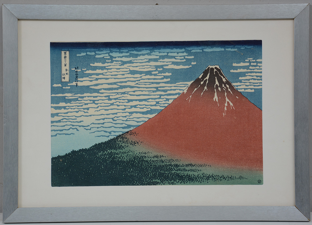 Xilografia a colori raffigurante monte Fuji con calligrafia, in cornice (difetti)