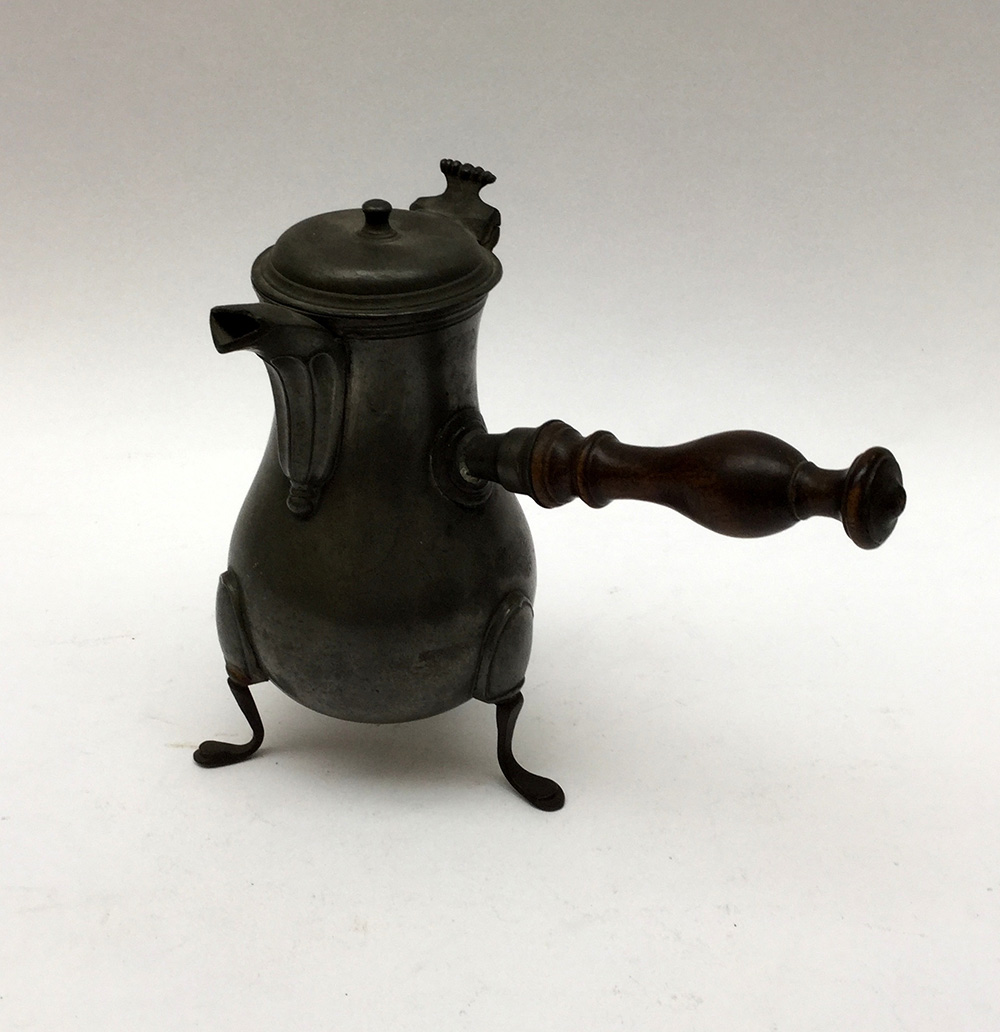 Cioccolatiera in peltro con manico in legno tornito e tre piedini sagomati (h...