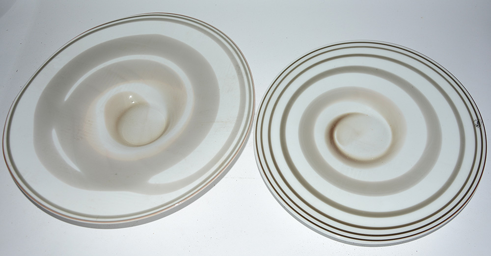 Lotto composto da due centrotavola tondi in vetro policromo nei toni del verde e marrone (d max cm 43)