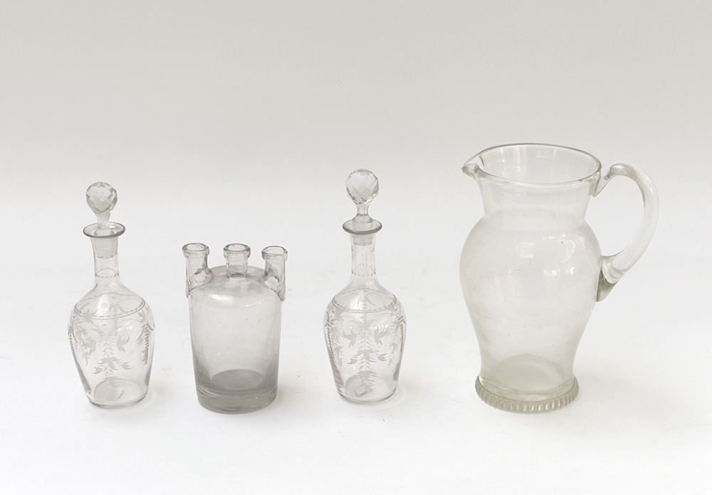 Lotto composto da due ampolle, una brocca e una boccetta a tre colli, in vetro del secolo XIX