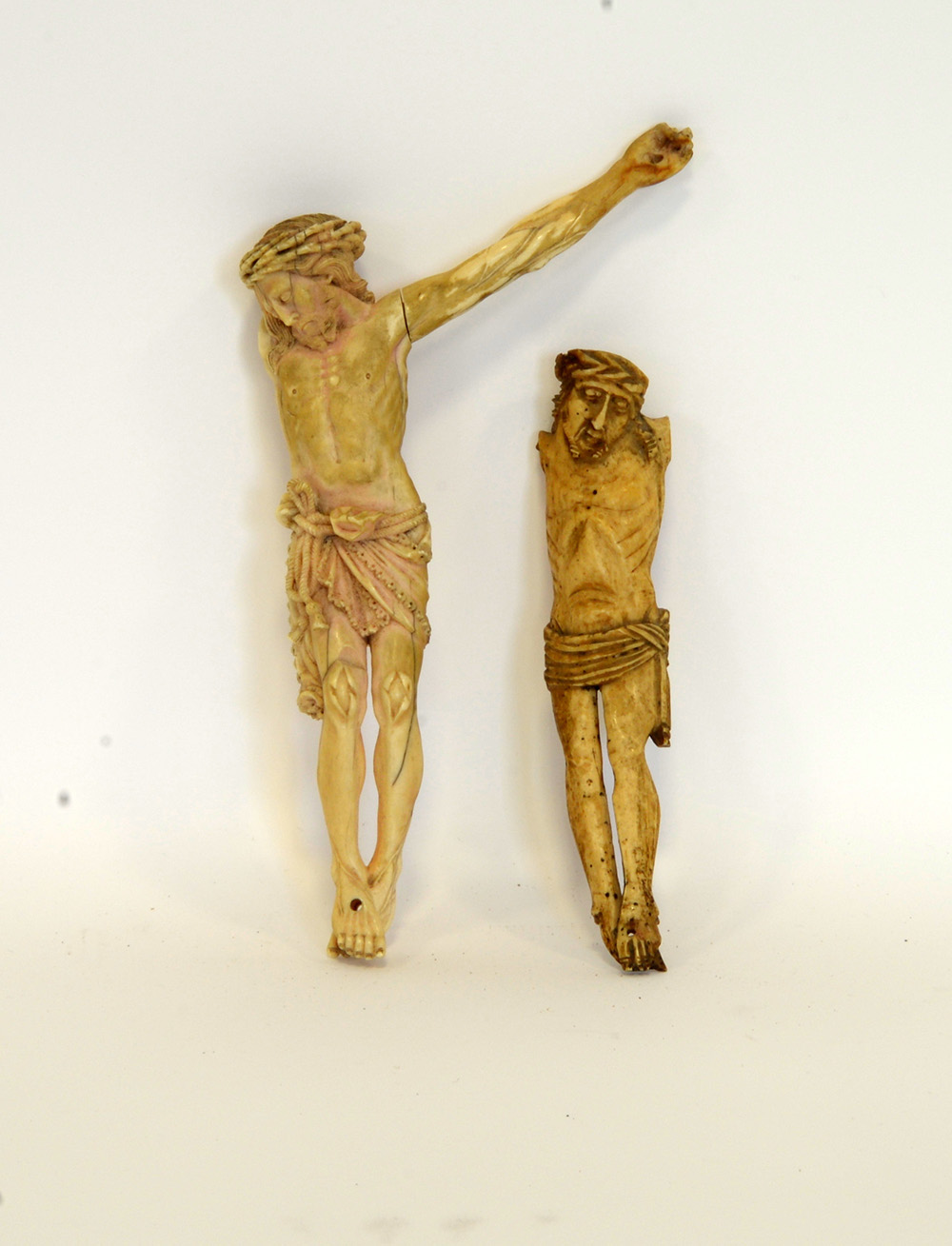 Lotto composto da due sculture in avorio di epoche diverse raffiguranti Cristo Crocifisso (difetti e mancanze)