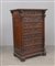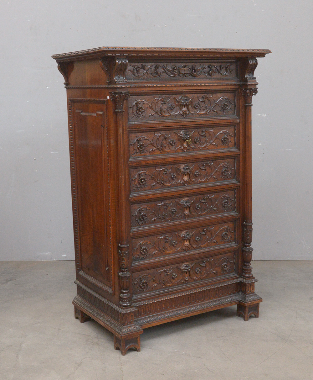 Settimanale in noce con fronte riccamente intagliato con mascheroni, animali fantastici e motivi vegetali. Montanti a colonna tornita, inizia secolo XX (cm 95x140x57)