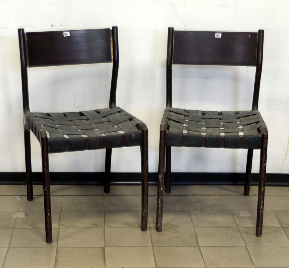 Coppia di sedie con schienale a giorno e seduta a fasce intrecciate in similpelle (difetti)
