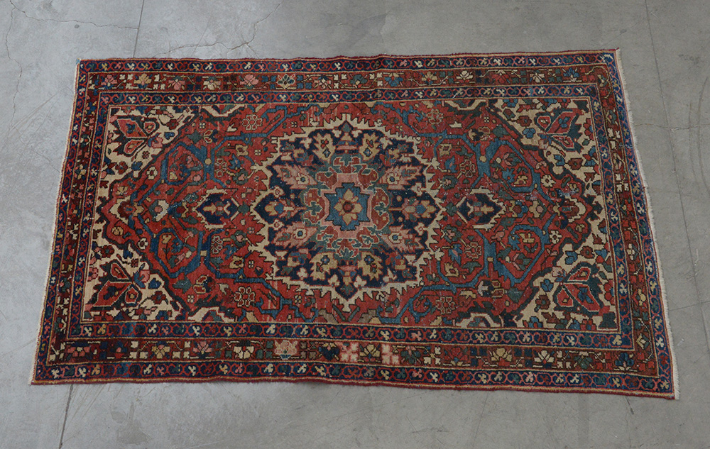 Disegno Heritz con medaglione polilobato e puntali su fondo rosso (cm 221x136) (Difetti)