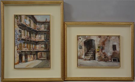 Cocchetti "Case di ringhiera" due dipinti ad olio su masonite, firmati....