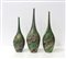 Gruppo di tre bottiglie in vetro soffiato a macchie policrome con prevalenza di toni verdi rosati e beige. Esecuzione recente. (h cm 52,5)