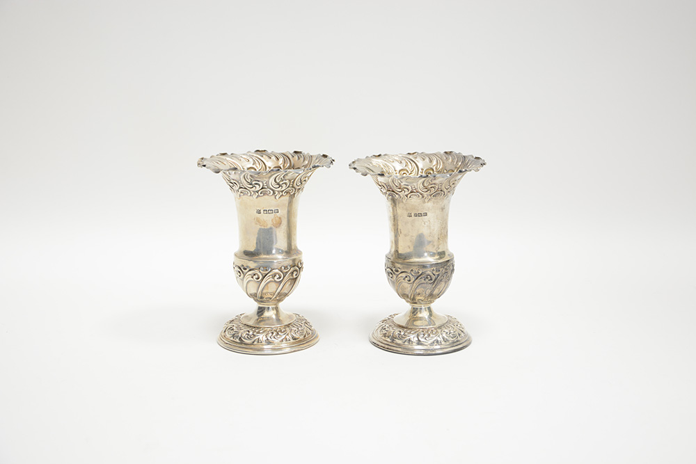 Coppia di vasetti in argento sbalzato decorati a volute e motivi vegetali. Punzoni inglesi (gr 300 circa)