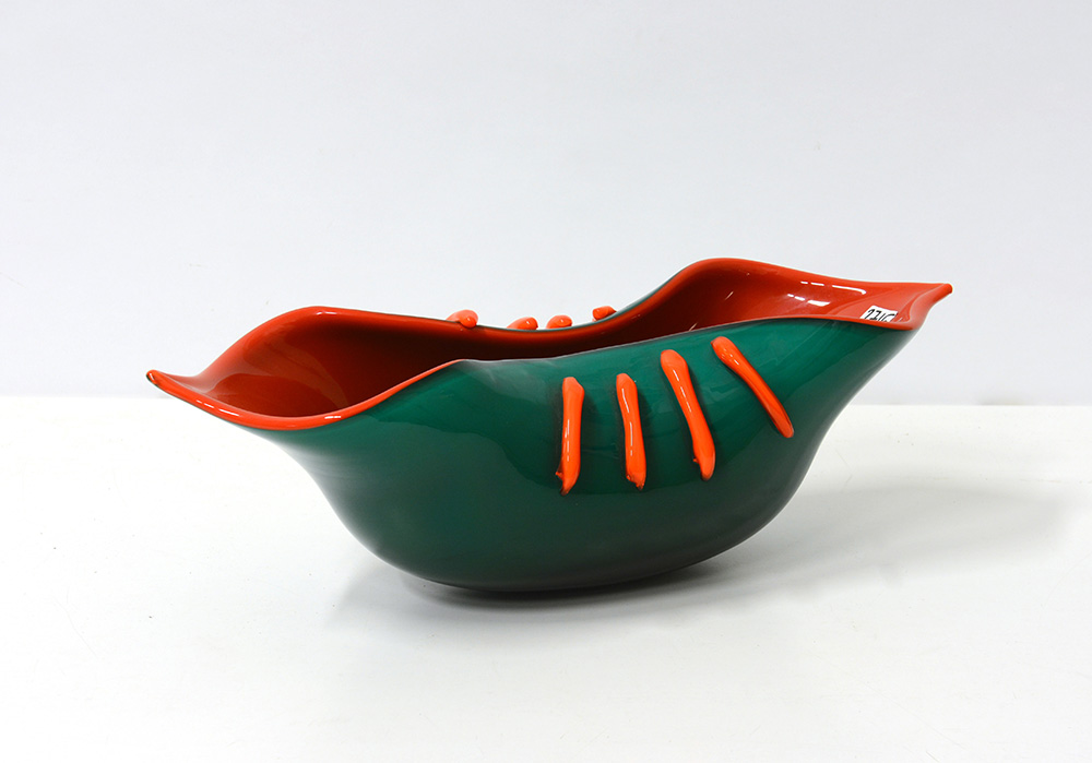 Centrotavola in vetro incamiciato arancione e verde con applicazioni a caldo in pasta vitrea arancione. Esecuzione recente. (cm 51x17x15,5)