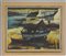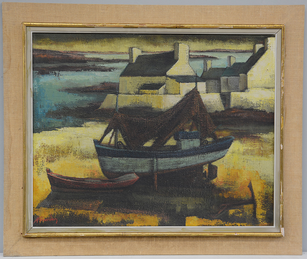 "Le chalutier bleu" olio su tela (cm 65x80) firmato in basso a sinistra, firmato e titolato al retro, in cornice (difetti)