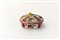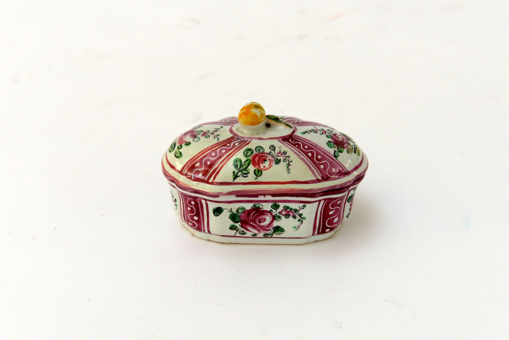 Manifattura emiliana, secolo XIX. Piccola scatola con coperchio in maiolica decorata a cartelle centrate da rose e alternate da motivi stilizzati. Presa in forma di frutto (largh. cm 10) (difetti)