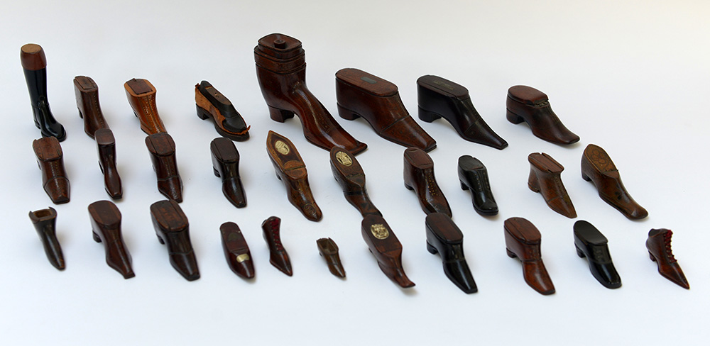 Collezione di ventiquattro snuff box del secolo XIX a forma di scarpa in materiali diversi unito ad alcuni modellini di calzature (difetti e mancanze)