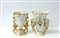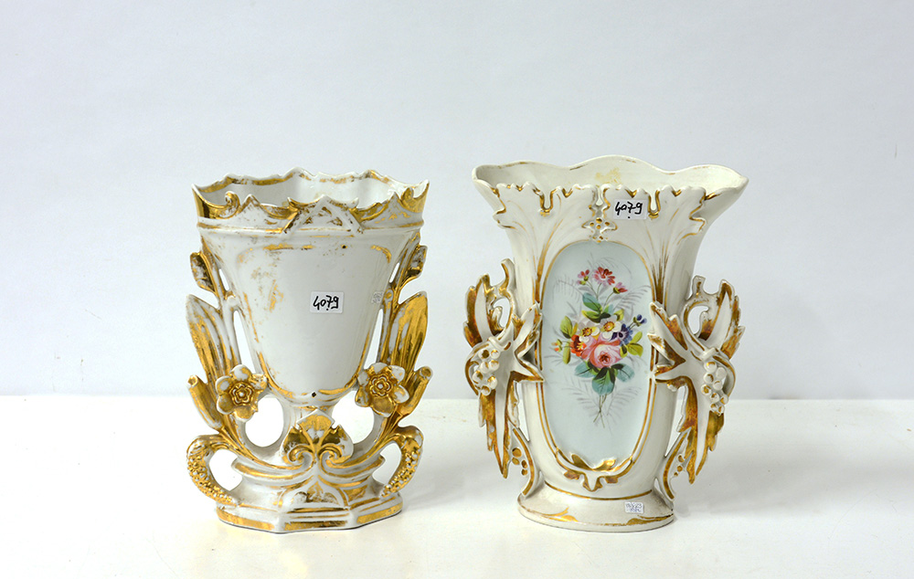 Manifattura francese del secolo XIX, due vasi portafiori in porcellana decorata in policromia a fiori fregi dorati. Misure diverse (difetti)