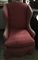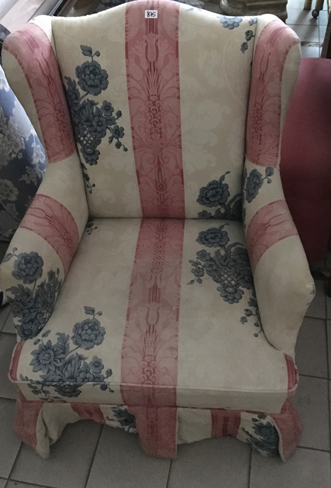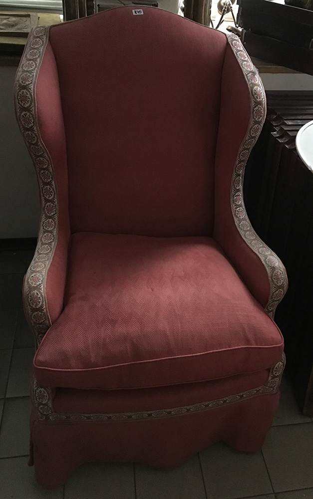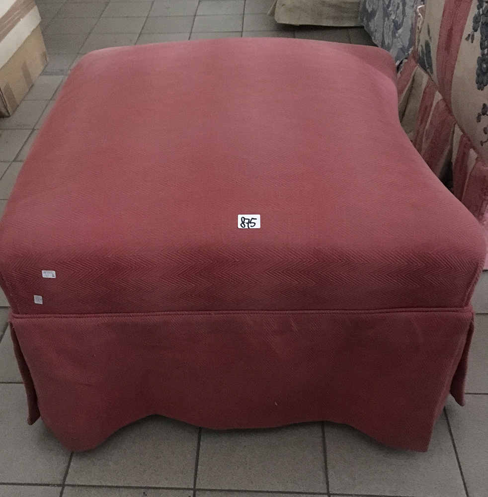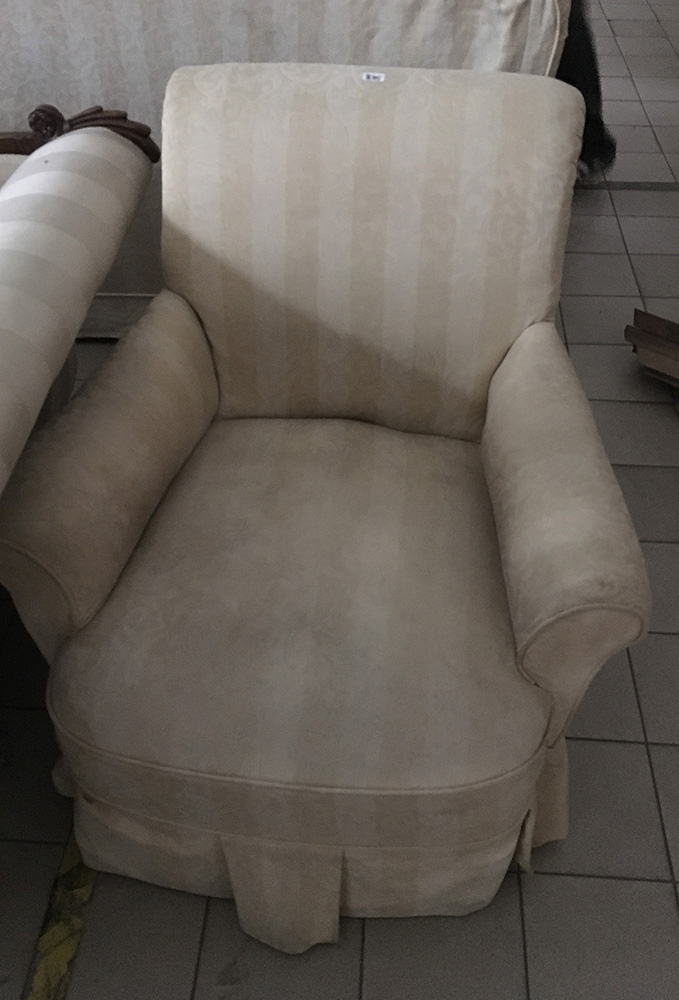 Lotto composto da tre poltrone imbottite di fatture differenti e un pouf rivestito in tessuto color salmone (difetti)