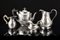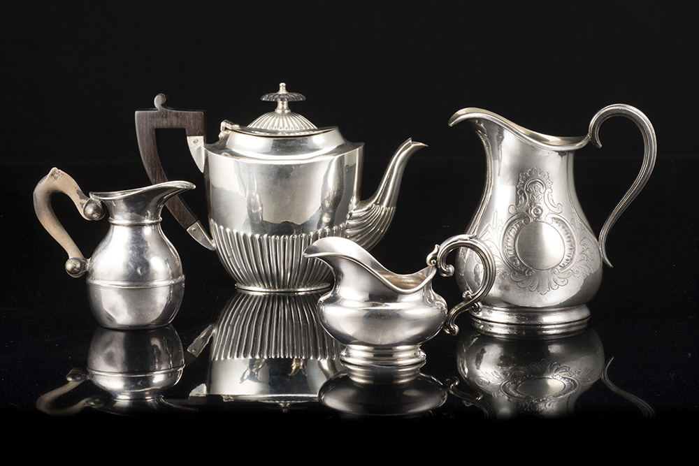 Lotto 887 | Lotto composto da una caffettiera e tre lattiere in metallo argentato