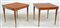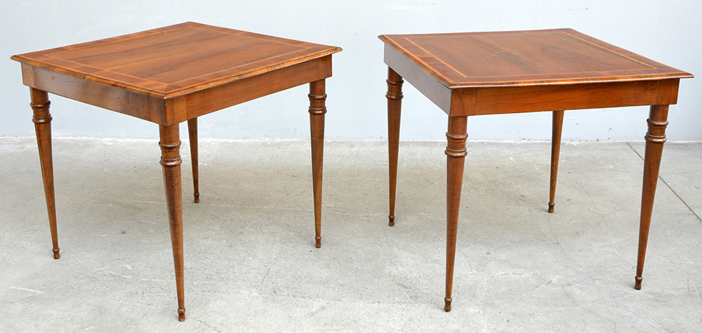 Coppia di tavolini quadrati con gambe tornite e rastremate, piani lastronati e filettati con legni differenti. Inizio secolo XIX (cm 75x72x75) (difetti)