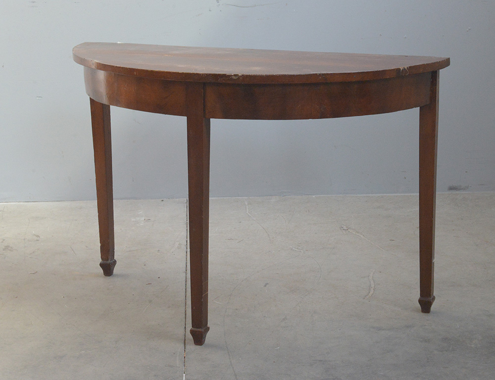 Consolle in mogano a mezza luna con tre gambe rastremate. Sec. XIX (cm 118x79x53) (difetti)