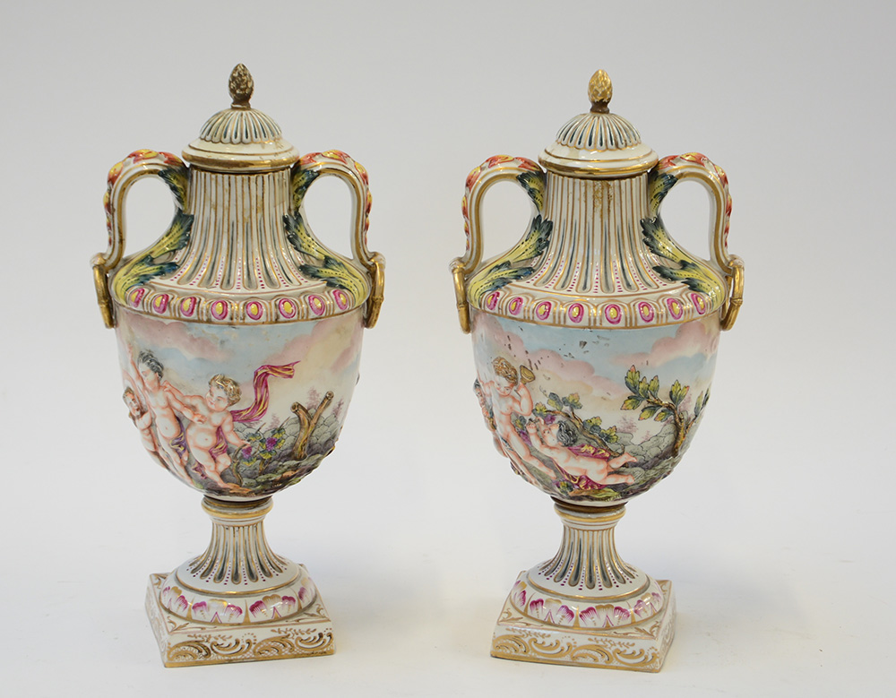Manifattura di Capodimonte secolo XIX Coppia di vasi in porcellana decorati in rilievo con putti in un paesaggio ed in policromia a motivi vegetali, fregi dorati, coperchi decorati da pigna a tutto tondo (h cm 37)(difetti, restauri ai coperchi)