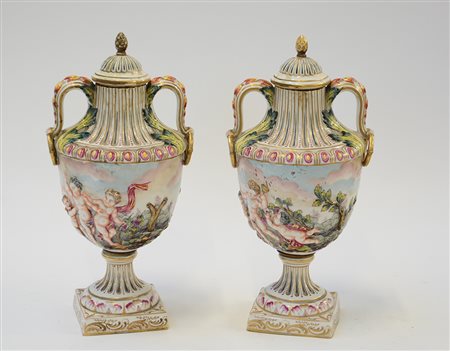 Manifattura di Capodimonte secolo XIX Coppia di vasi in porcellana decorati...