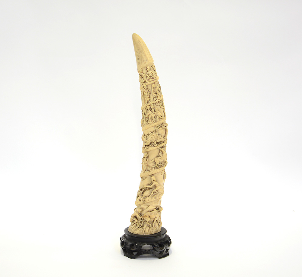 Scultura in materiale sintetico scolpita a scene di vita orientale con base in legno (difetti)(h. 40 cm.)