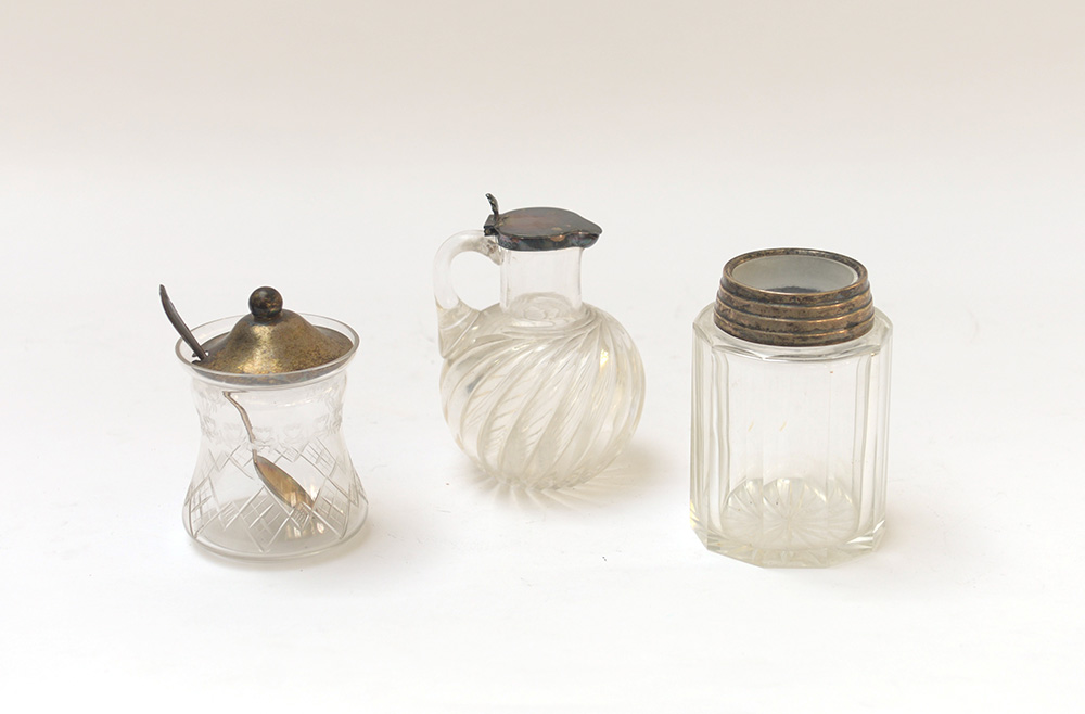 Lotto composto da tre contenitori in vetro con guarnizioni in metallo argentato (difetti)