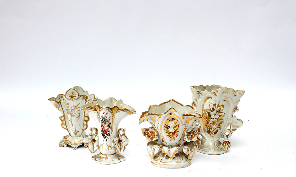 Manifattura francese del secolo XIX, lotto di quattro vasetti portafiori in porcellana decorata in policromia a fiori e fregi dorati, misure diverse (difetti)